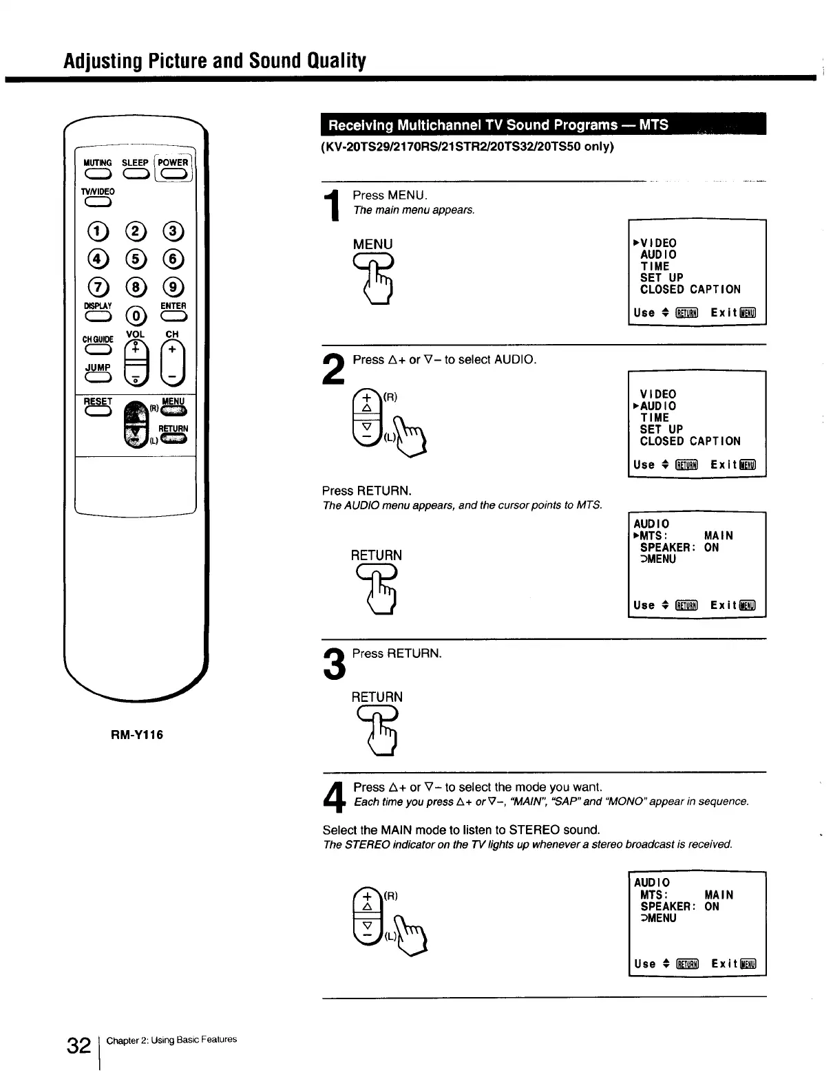 Press Z_+or V- to select the mode you want.Eachtime you press Z_+ or V-, "MAIN", "SAP"and "MONO" appear in sequence.