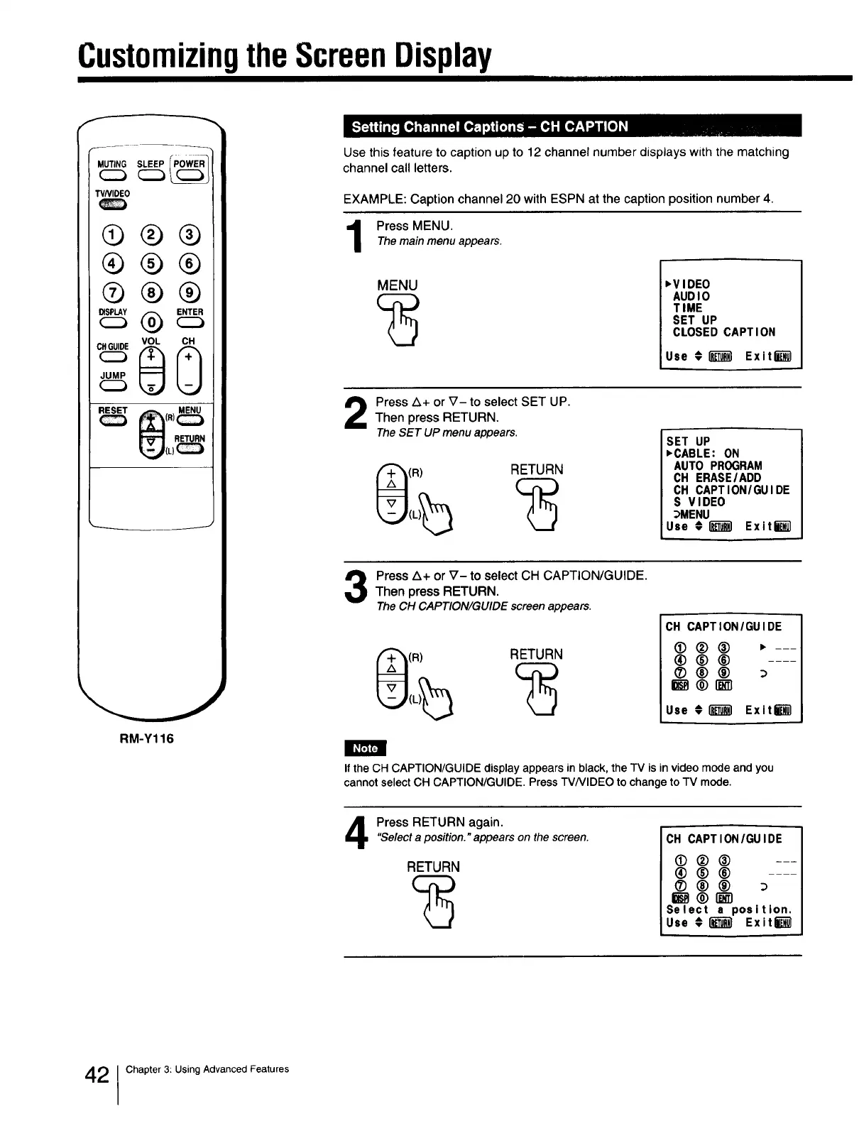 If the CH CAPTION/GUIDE display appears in black, the TV is in video mode and you