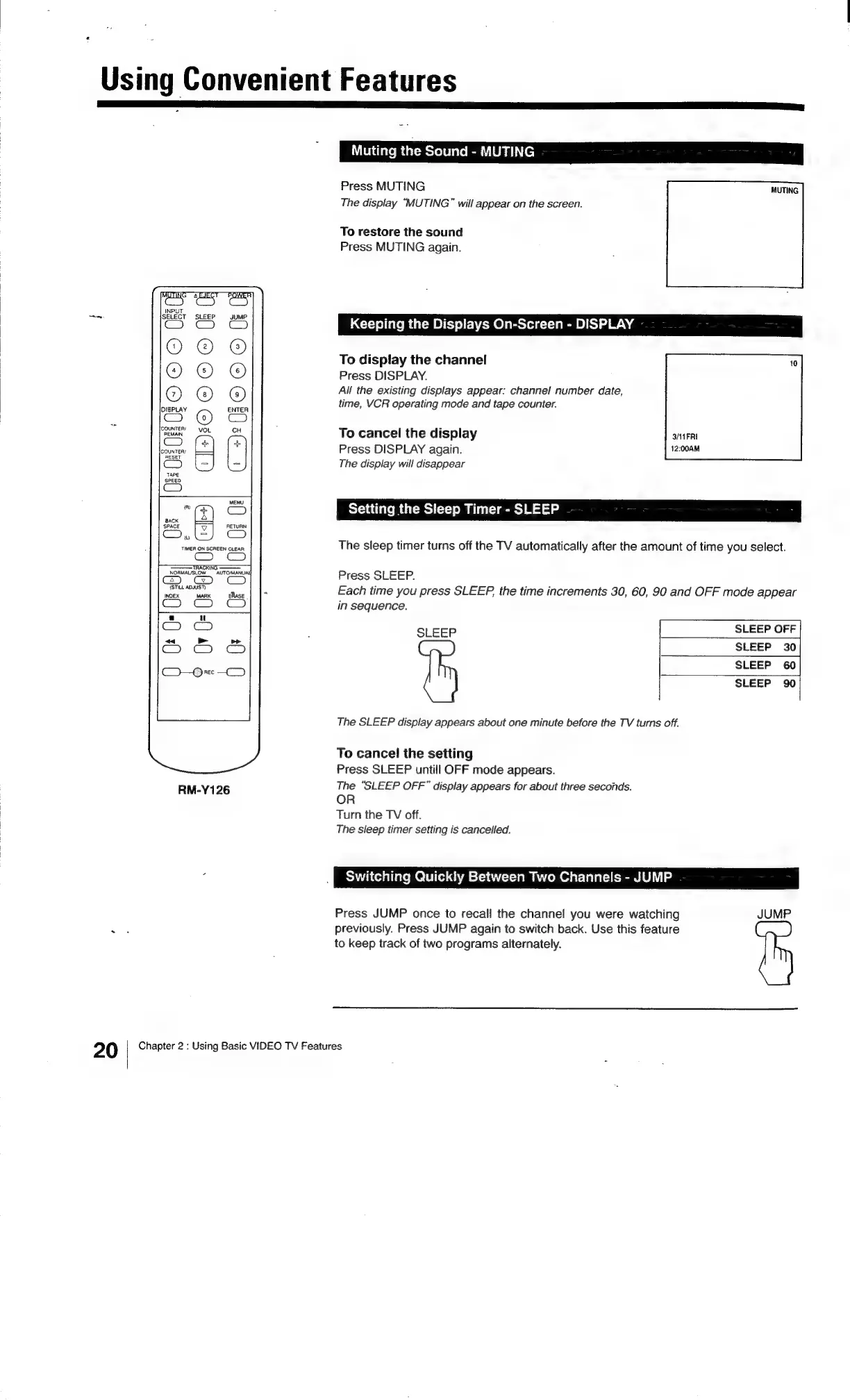 Sony Trinitron KV-13VM20 - Using Convenient Features; Muting the Sound - MUTING; Keeping the Displays On-Screen - DISPLAY; Etter Etetetees