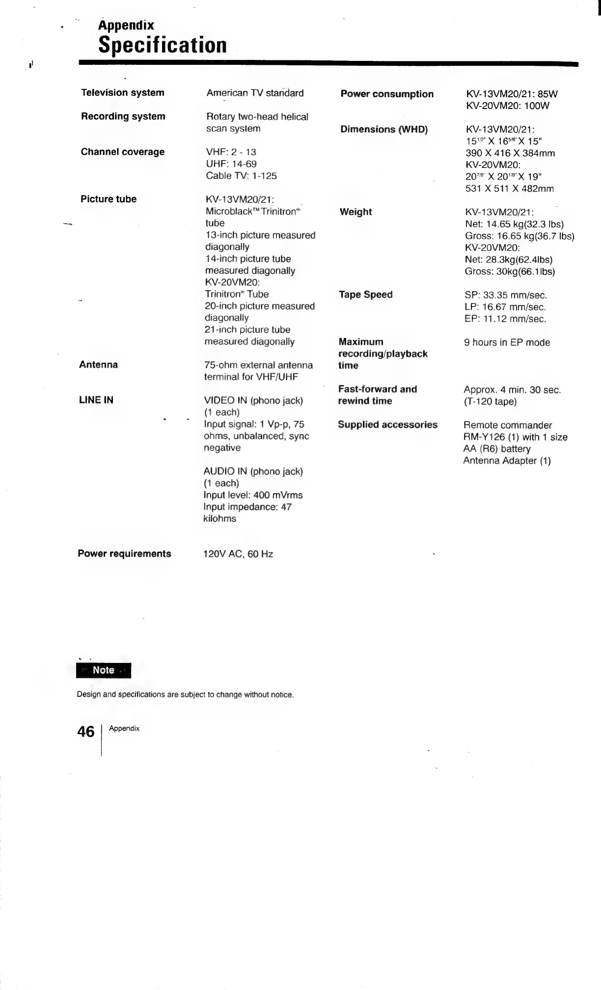 Sony Trinitron KV-13VM20 - Appendix Specifications; Ee Cece Cree C Cere Cesseseeeseeeeseteeeeneereaees; Chapter 5: Using Advanced VCR Features
