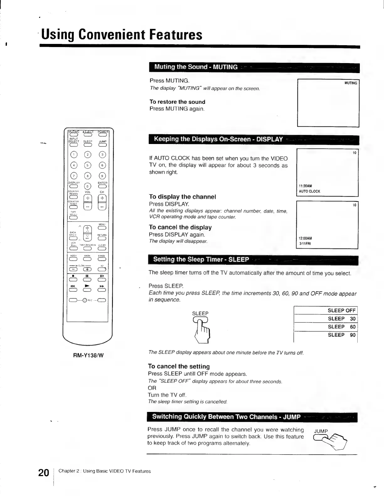 Sony Trinitron KV-13VM30 - Keeping the Displays On-Screen - DISPLAY; Muting the Sound - MUTING; Setting the Sleep Timer - SLEEP ou; Switching Quickly between Two Channels - JUMP