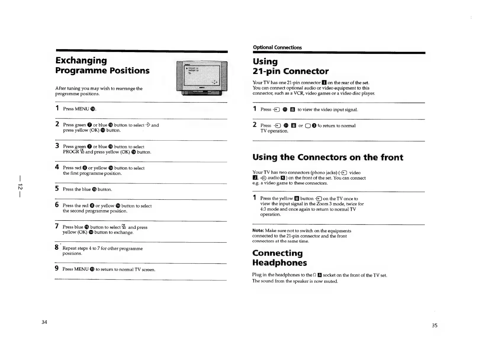 Sony TRINITRON KV-16WT1 - Exchanging Programme Positions; OPTIONAL CONNECTIONS; 21-pin Connector Usage; Front Panel Connectors