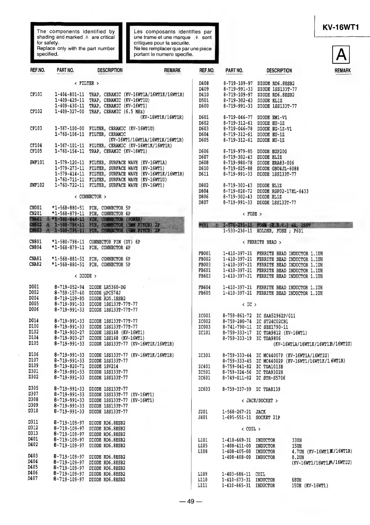 Sony TRINITRON KV-16WT1 - Component Categories List