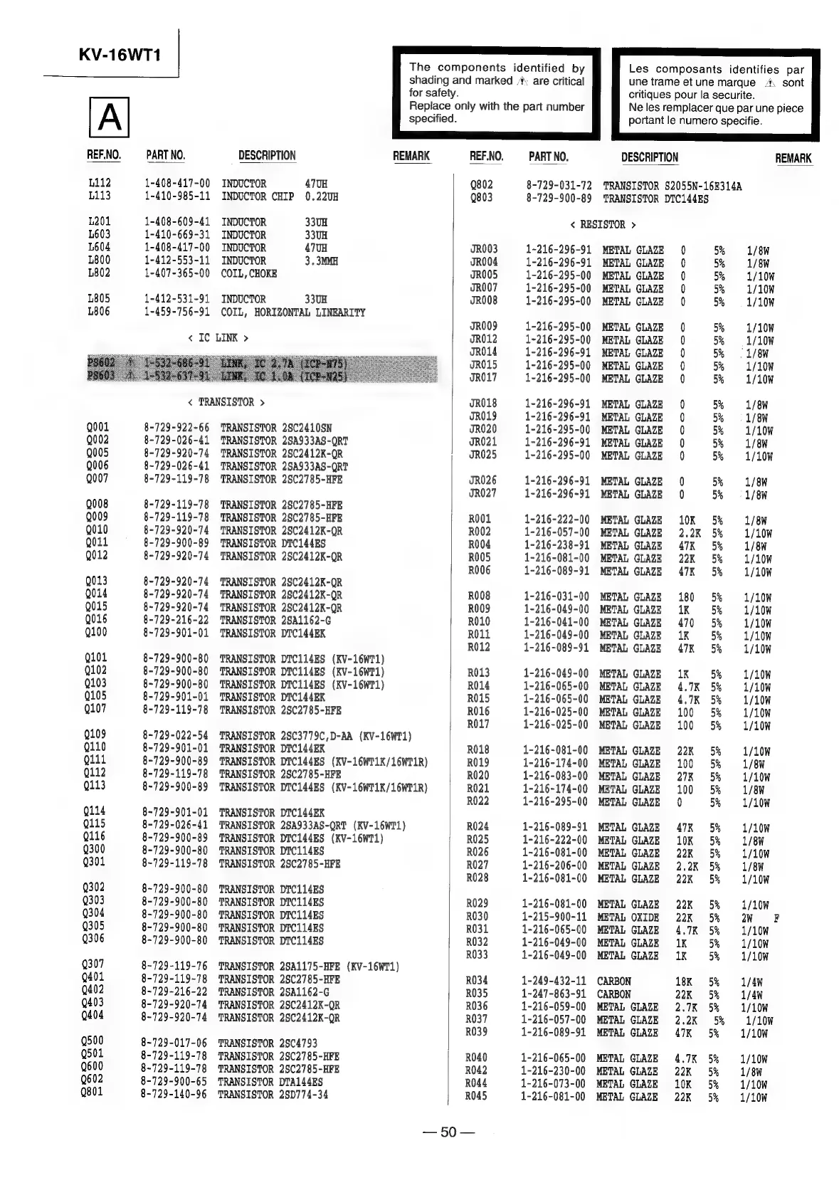 Sony TRINITRON KV-16WT1 - Chassis Parts List