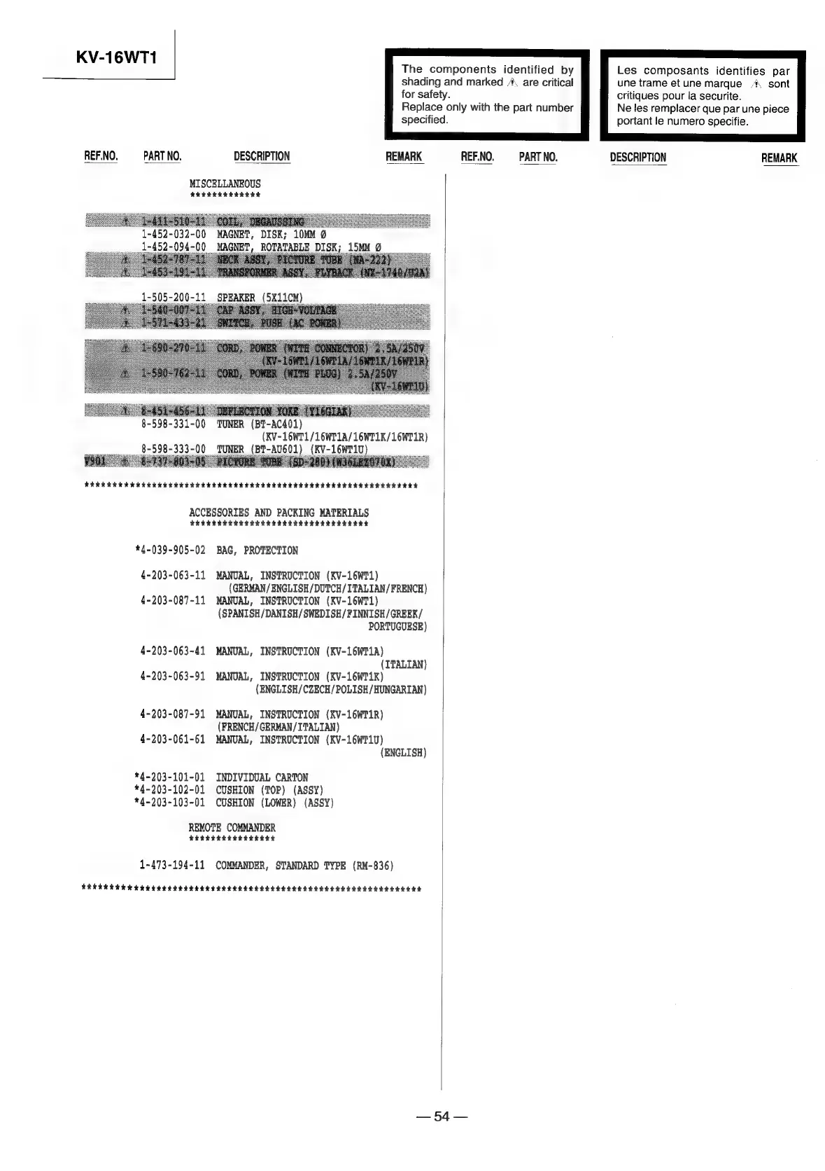 Sony TRINITRON KV-16WT1 - MISCELLANEOUS AND ACCESSORIES; Accessories and Packing Materials; Remote Commander