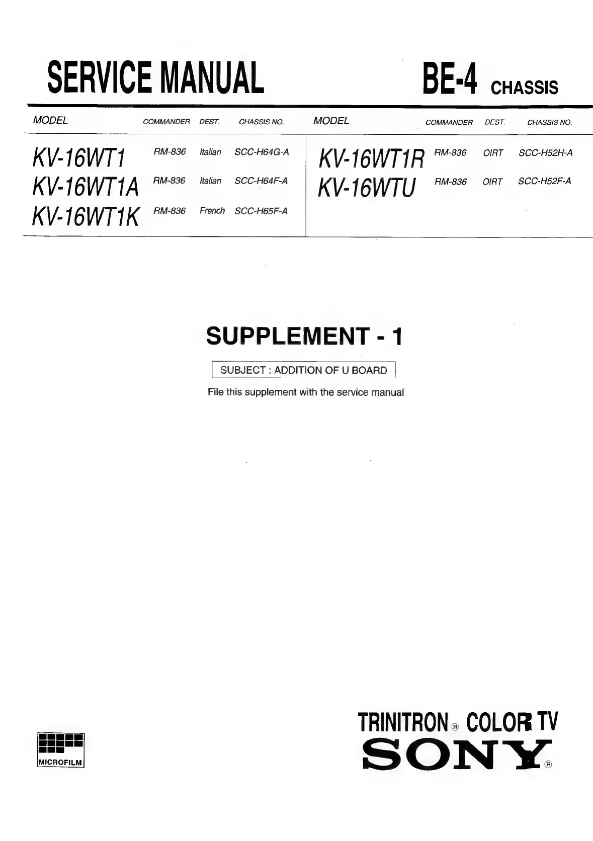 Sony TRINITRON KV-16WT1 - SUPPLEMENTAL INFORMATION; Addition of U Board