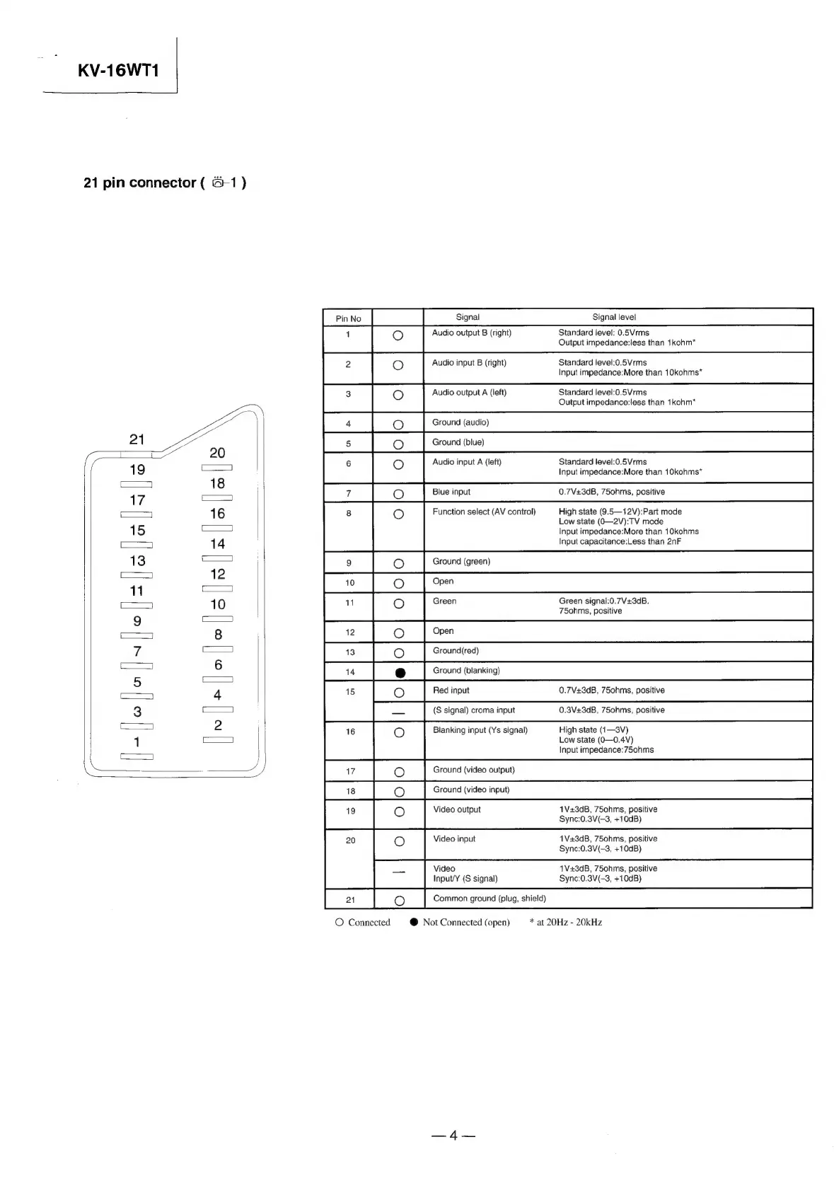 Sony TRINITRON KV-16WT1U - 21-Pin Connector Details; Pin Assignments and Signals