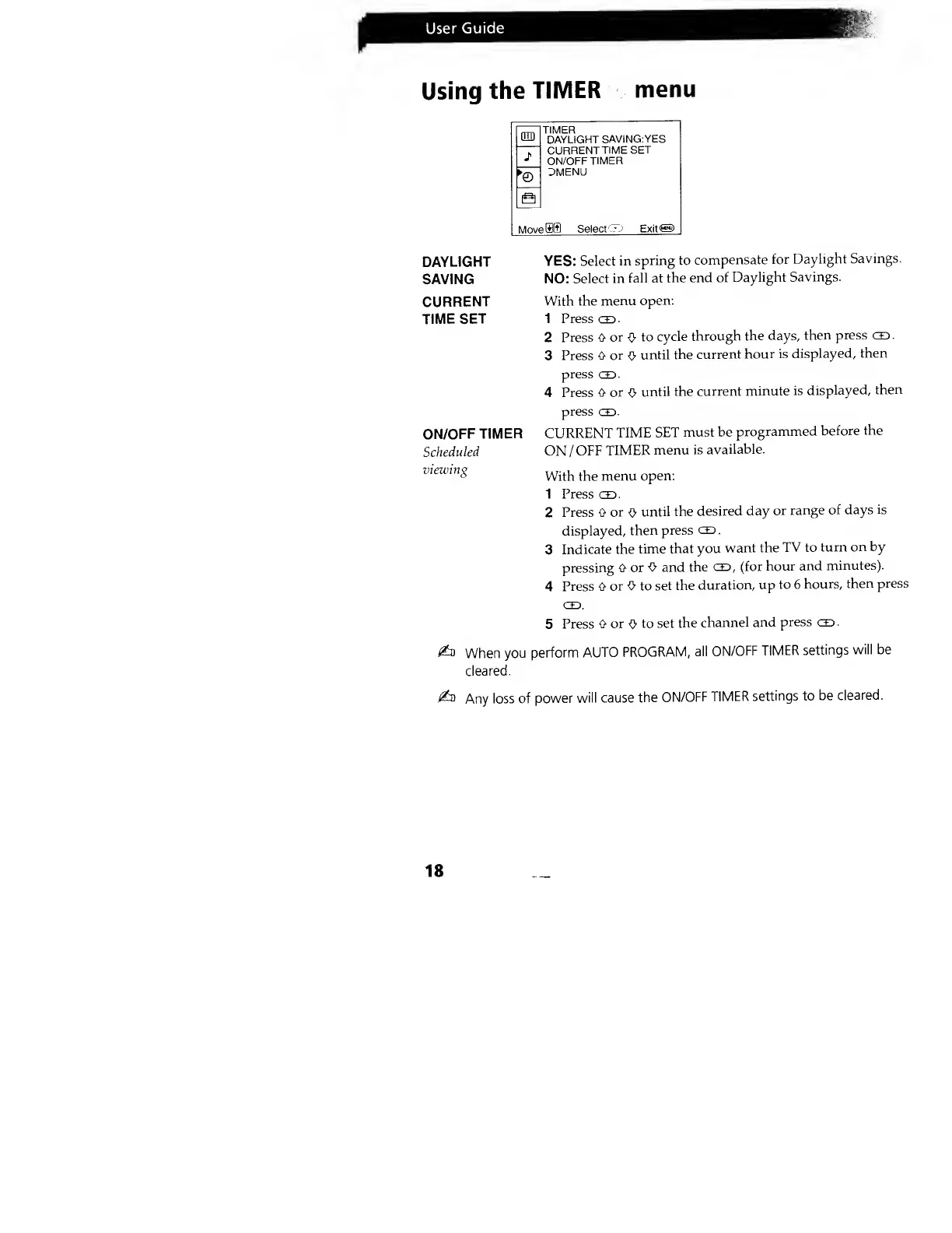 Sony Trinitron KV-20FV10 - Timer Functions; Setting Time and Daylight Saving; On;Off Timer Scheduling