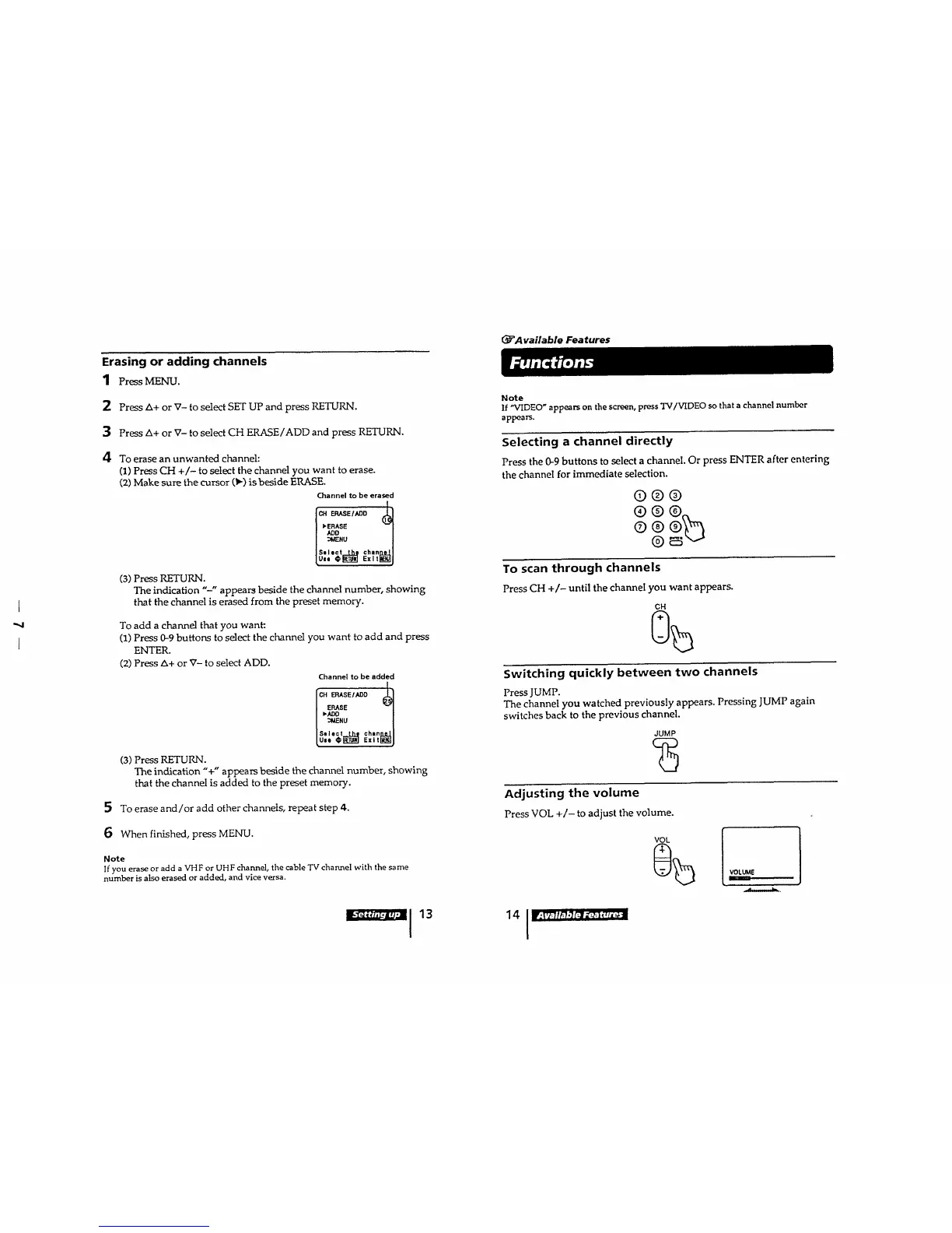 Sony TRINITRON KV-20M10 - Functions; Erasing or Adding Chanenls; Selecting a Channel Directly; Switching Quickly between Two Channels