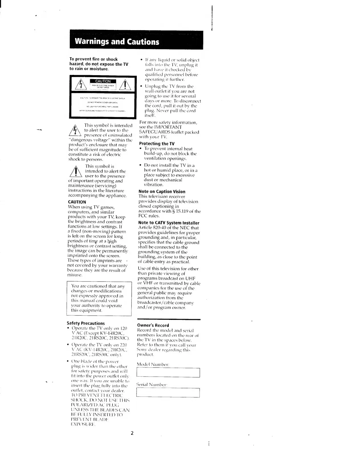 Sony Trinitron KV-20S20 - Warnings and Cautions; Safety Precautions
