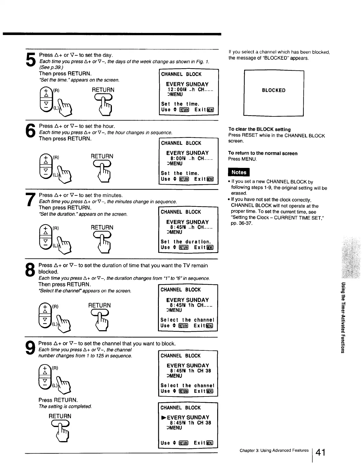 Press Z_+ or V- to set the channel that you want to block.Each time you press A+ or V-, the channel