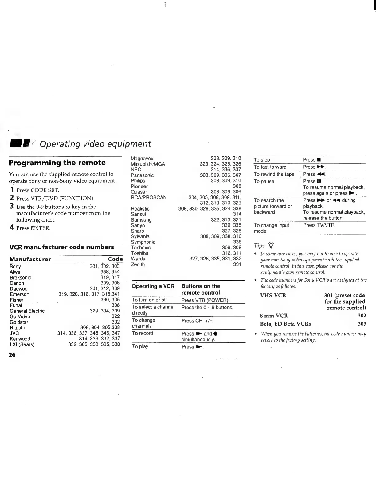 Sony Trinitron KV-20V80 - Programming the Remote