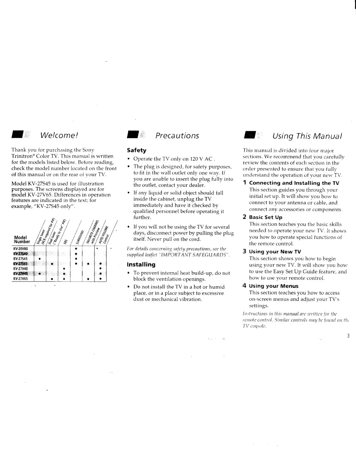 Sony Trinitron KV-20V80 - Welcome! Vo Iieccccccccccssecsessccusaesssseneees; PLO@CAUTIONS ou; Using this Manual; Connecting and Installing the TV