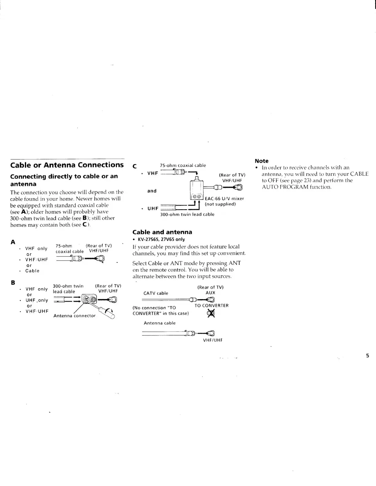 Sony Trinitron KV-20V80 - Cable or Antenna Connections; Connecting Directly to Cable; Cable and Antenna; OF an ANCONA! Oo