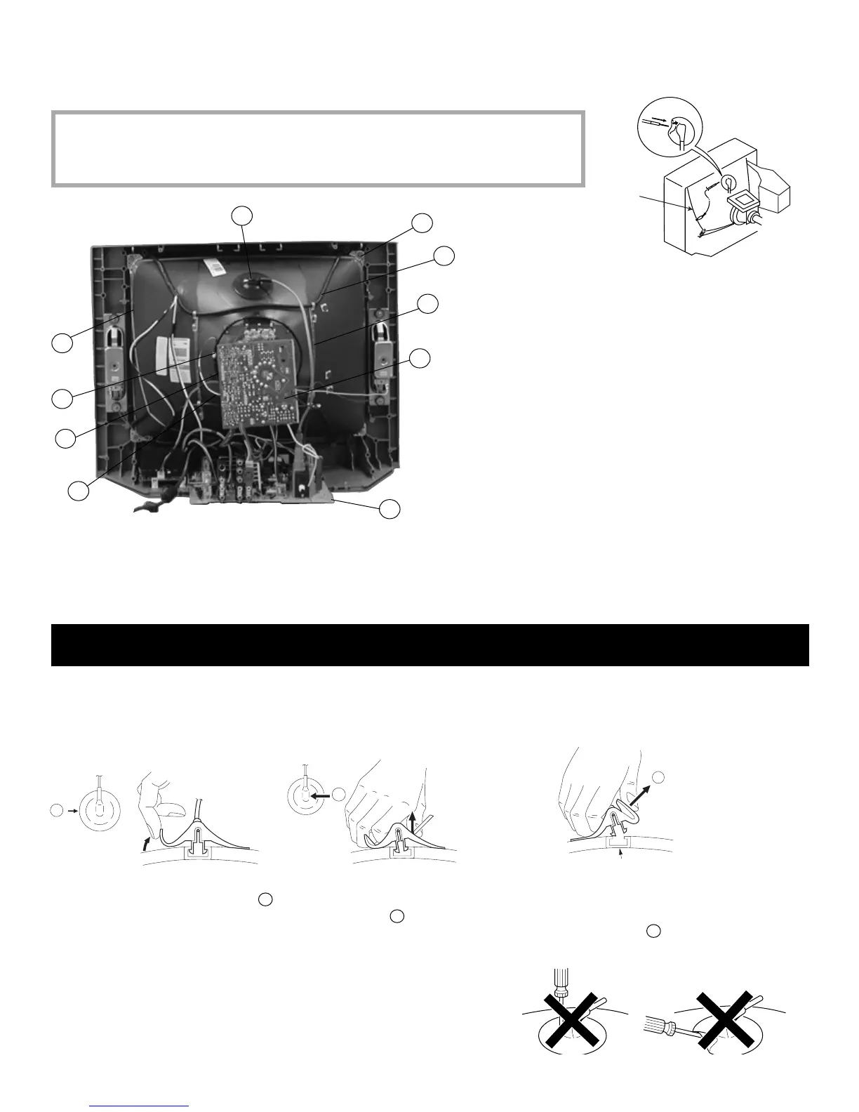 NOTE: After removing the anode cap, short circuit the anode of the picture tube and the anode cap to either the metal chassis, CRT shield, or carbon