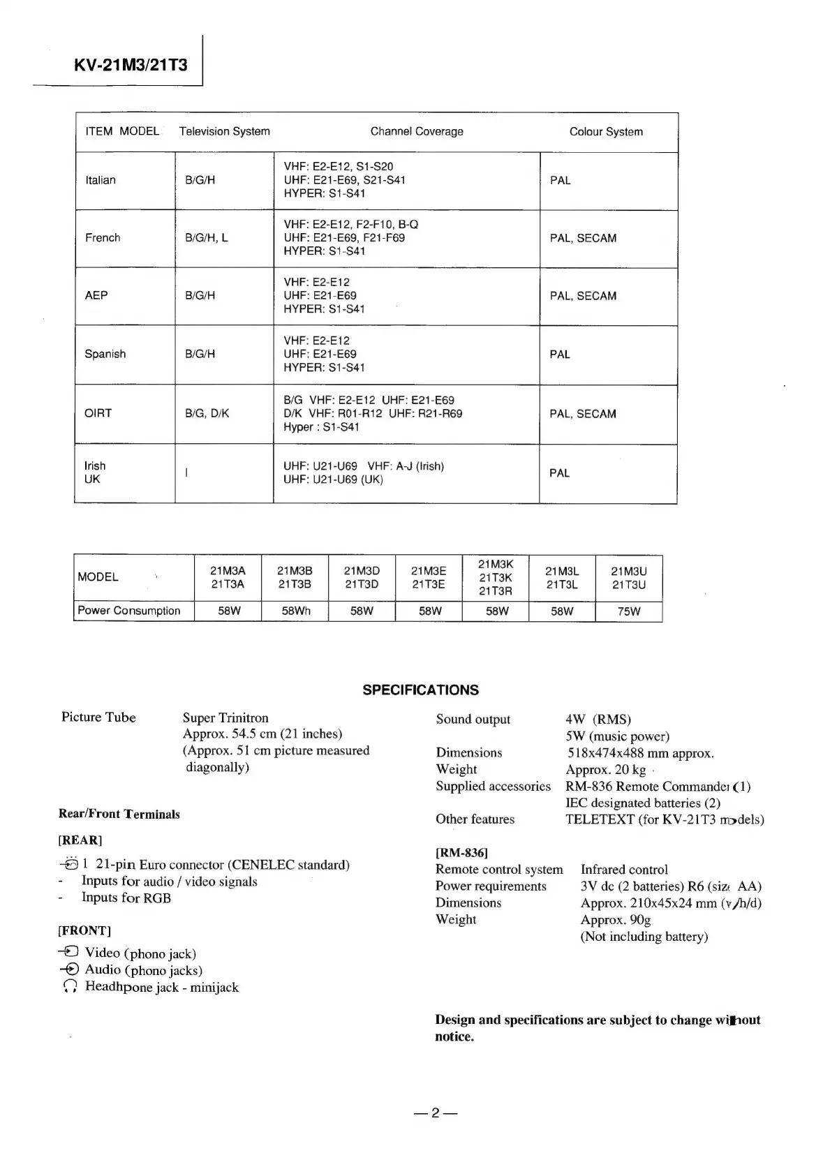 Sony TRINITRON KV-21M3B - Specifications; Rear;Front Terminals