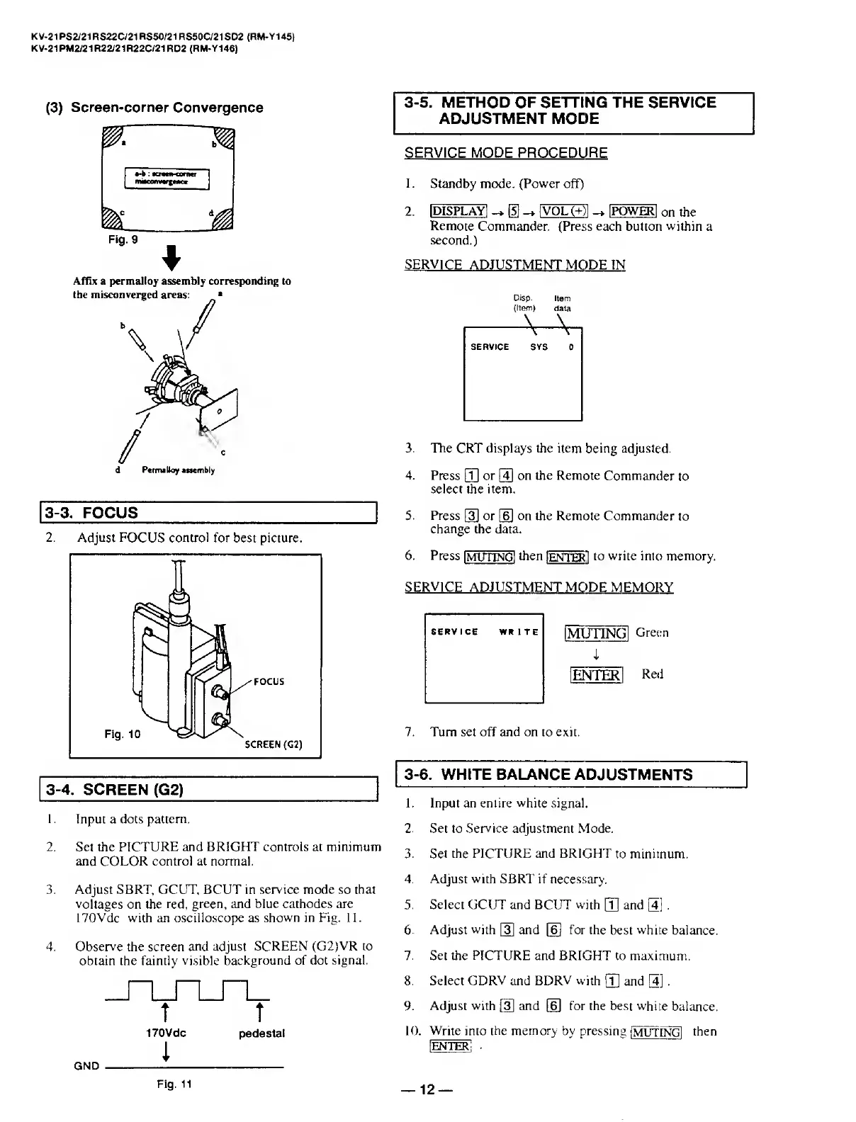Sony TRINITRON KV-21PM2 - Focus; Screen (G2) and White Balance; Setting the Service Adjustment Mode; White Balance Adjustments