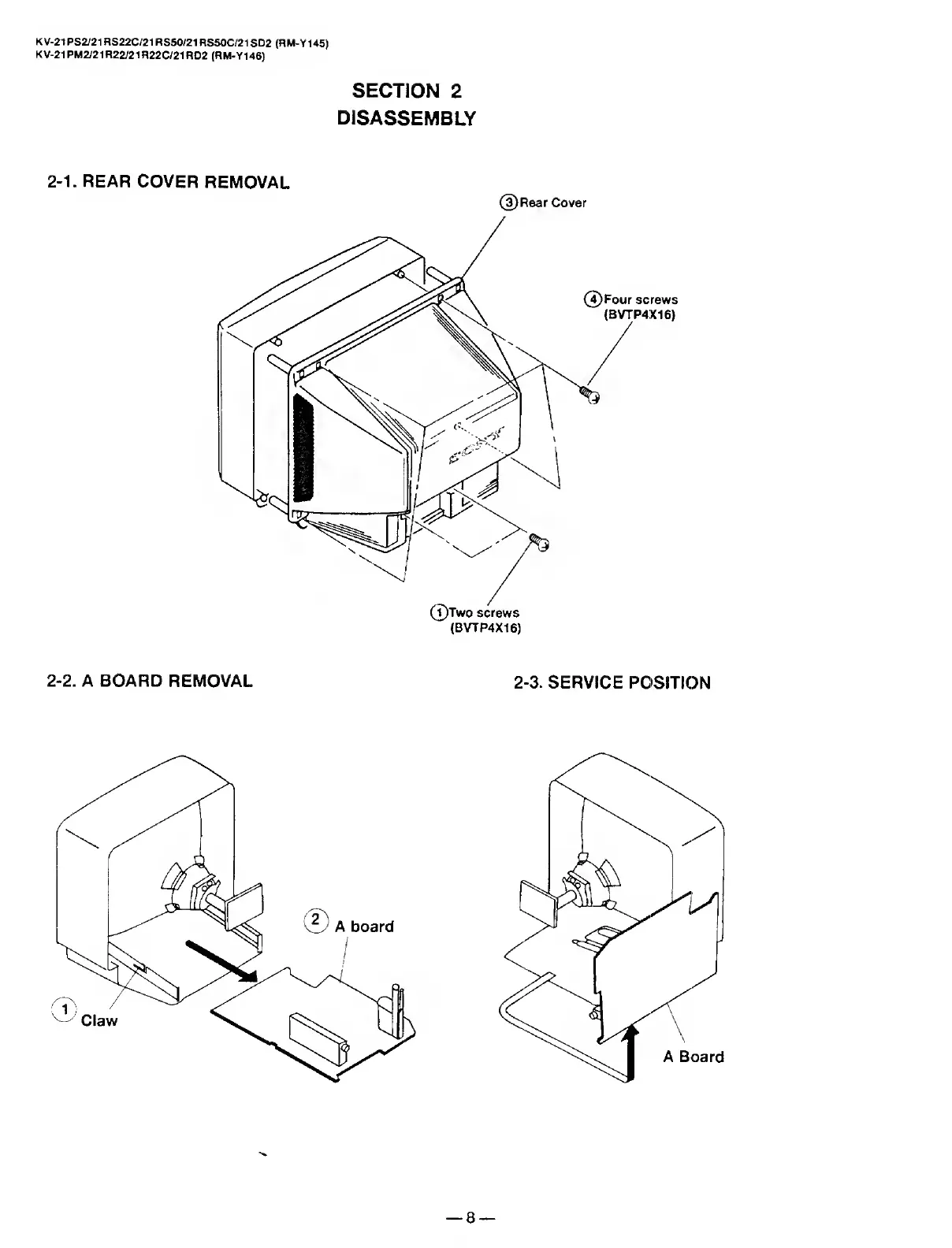Sony TRINITRON KV-21PM2 - SECTION 2 DISASSEMBLY; Rear Cover Removal; A Board Removal; Service Position