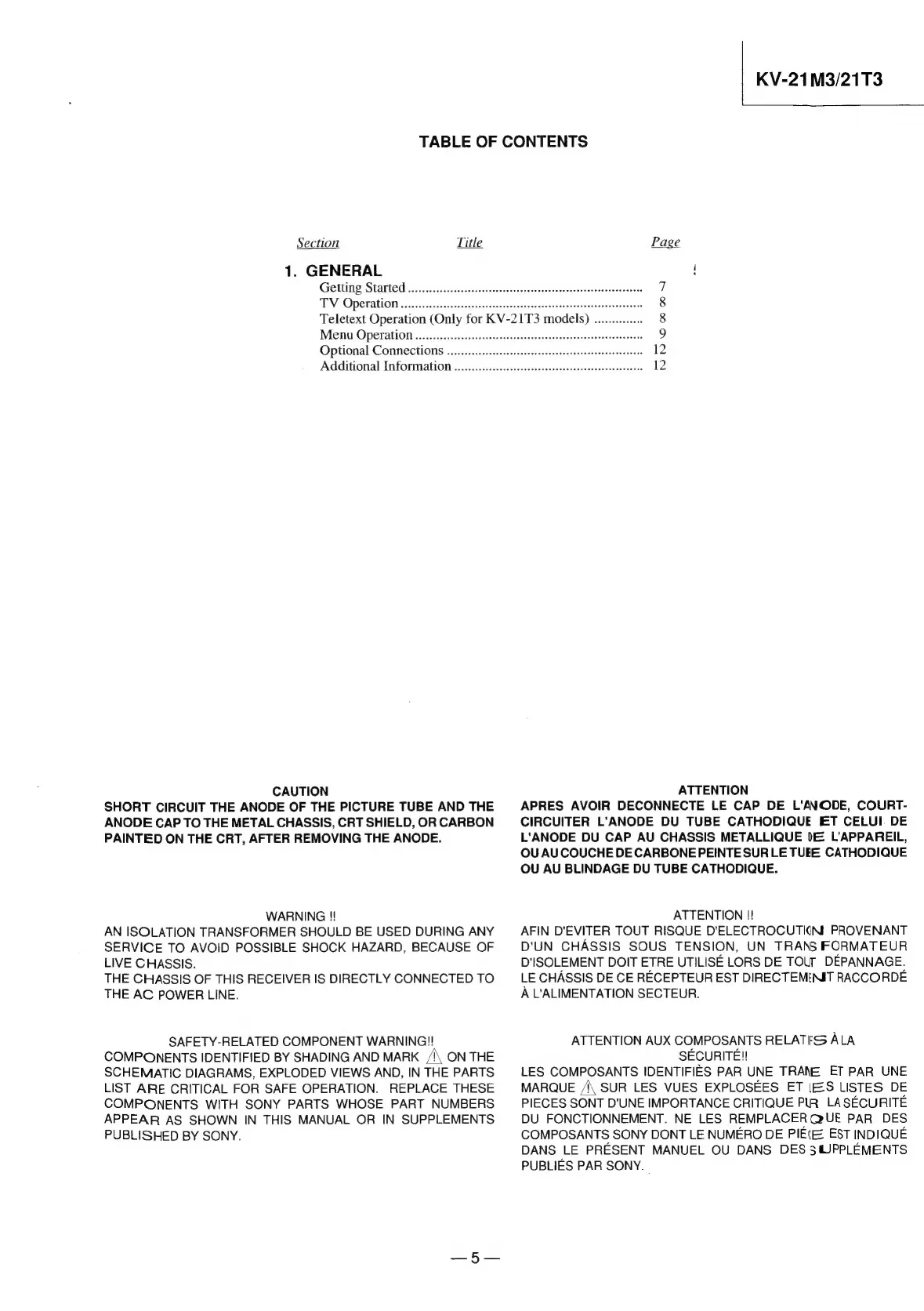 Sony TRINITRON KV-21T3E - Safety Information and Warnings; High Voltage and Shock Hazard; Safety Related Components