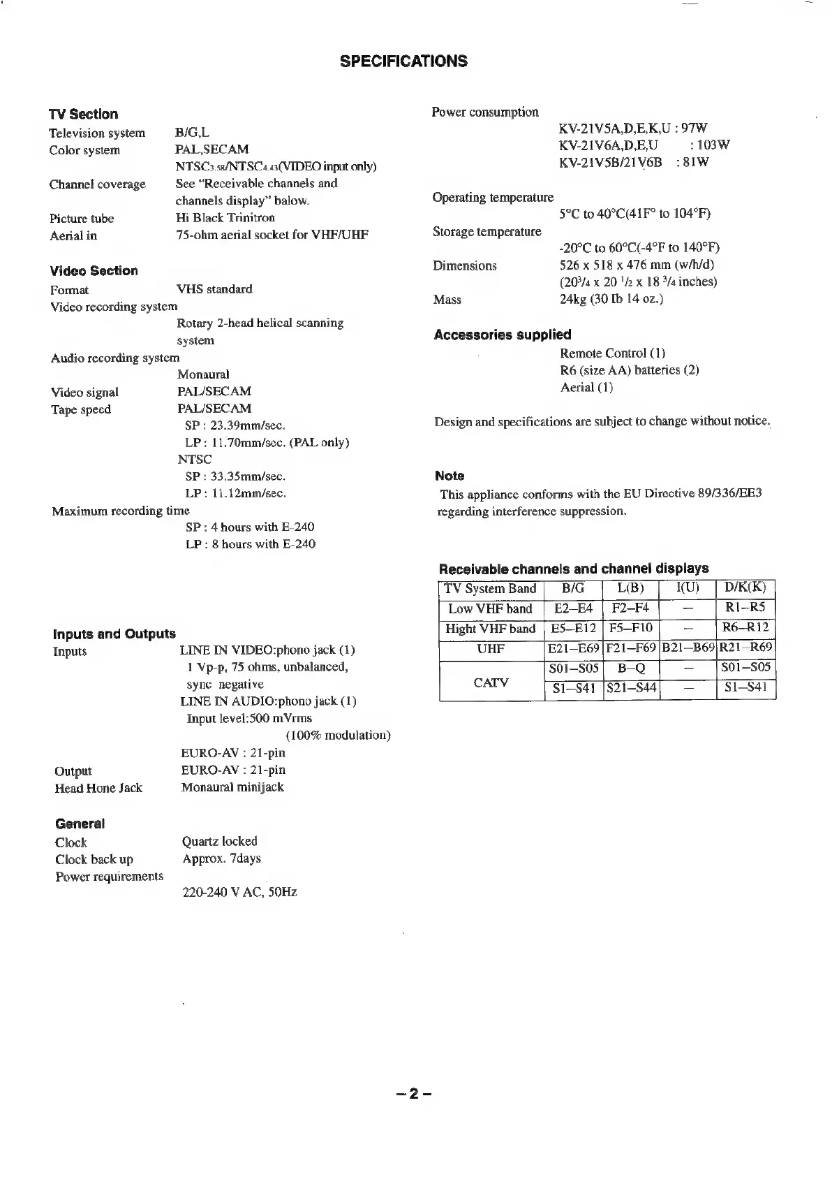 Sony TRINITRON KV-21V5A - Specifications; Accessories Supplied