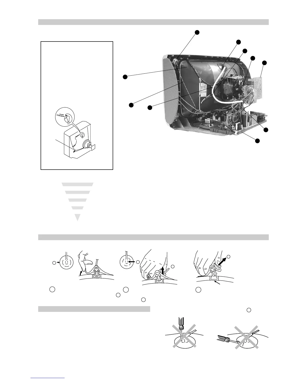 9. Unscrew the four CRT fixing screws [ located on each CRT