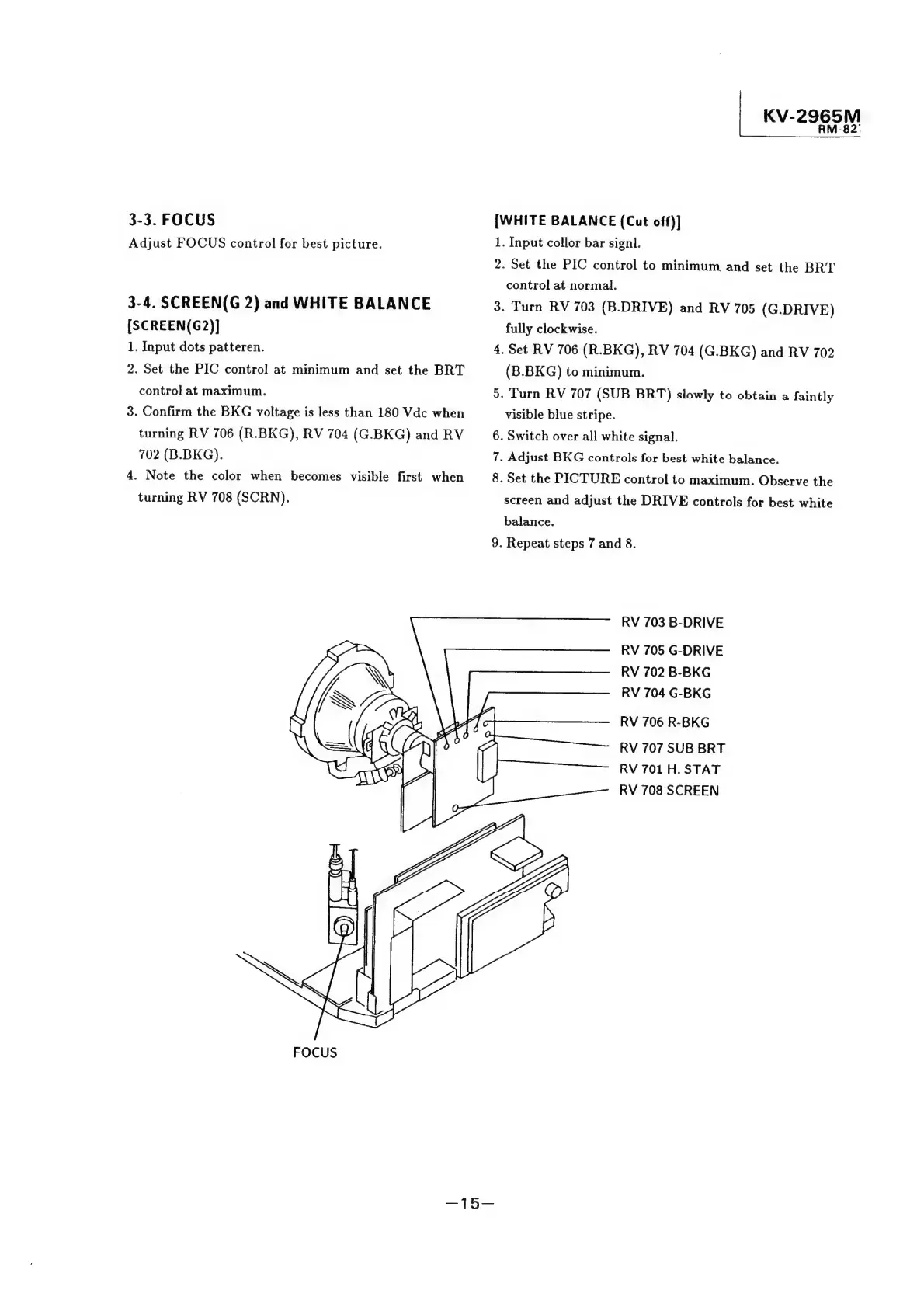 Sony TRINITRON KV-2565MT - Focus Adjustment; Screen (G2) and White Balance Adjustments; Screen (G2) Adjustment; White Balance (Cut off) Adjustment