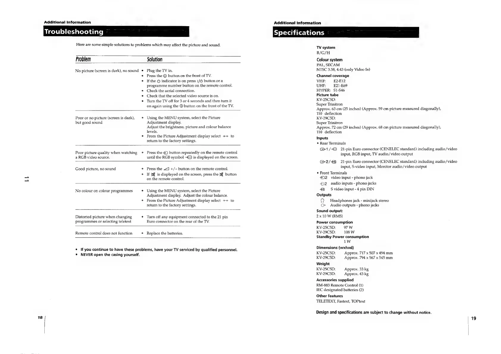 Sony TRINITRON KV-25C5A - Troubleshooting Guide; Technical Specifications