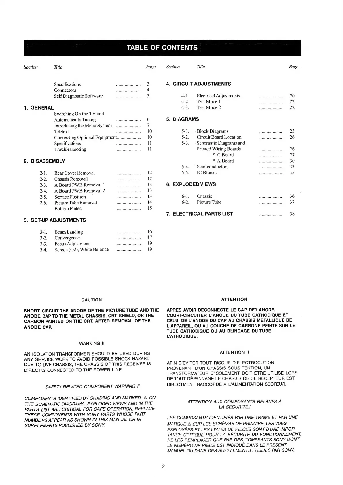 Sony TRINITRON KV-25FX30B - Table of Contents