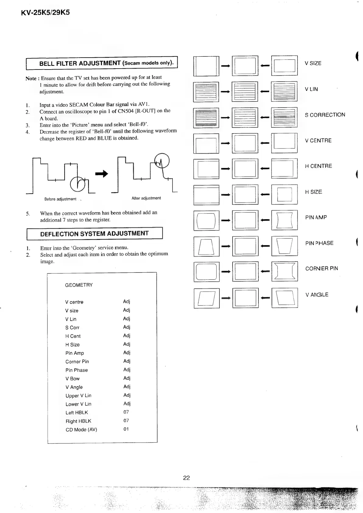 Sony Trinitron KV-25K5A - SECTION 4 CIRCUIT ADJUSTMENTS; Bell Filter Adjustment; Deflection System Adjustment