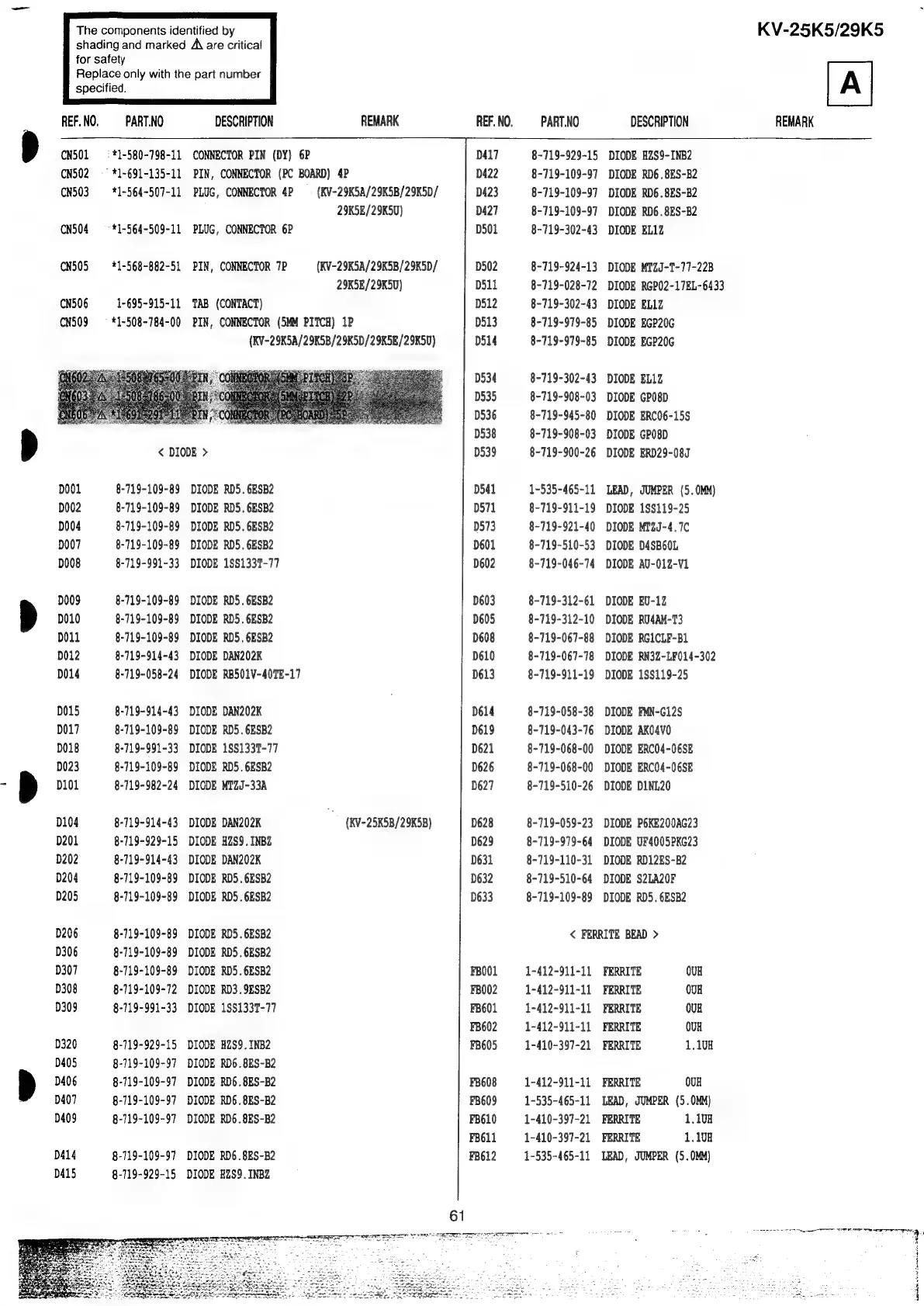 Sony Trinitron KV-25K5A - SECTION 7 ELECTRICAL PARTS LIST; Diodes; Ferrite Beads