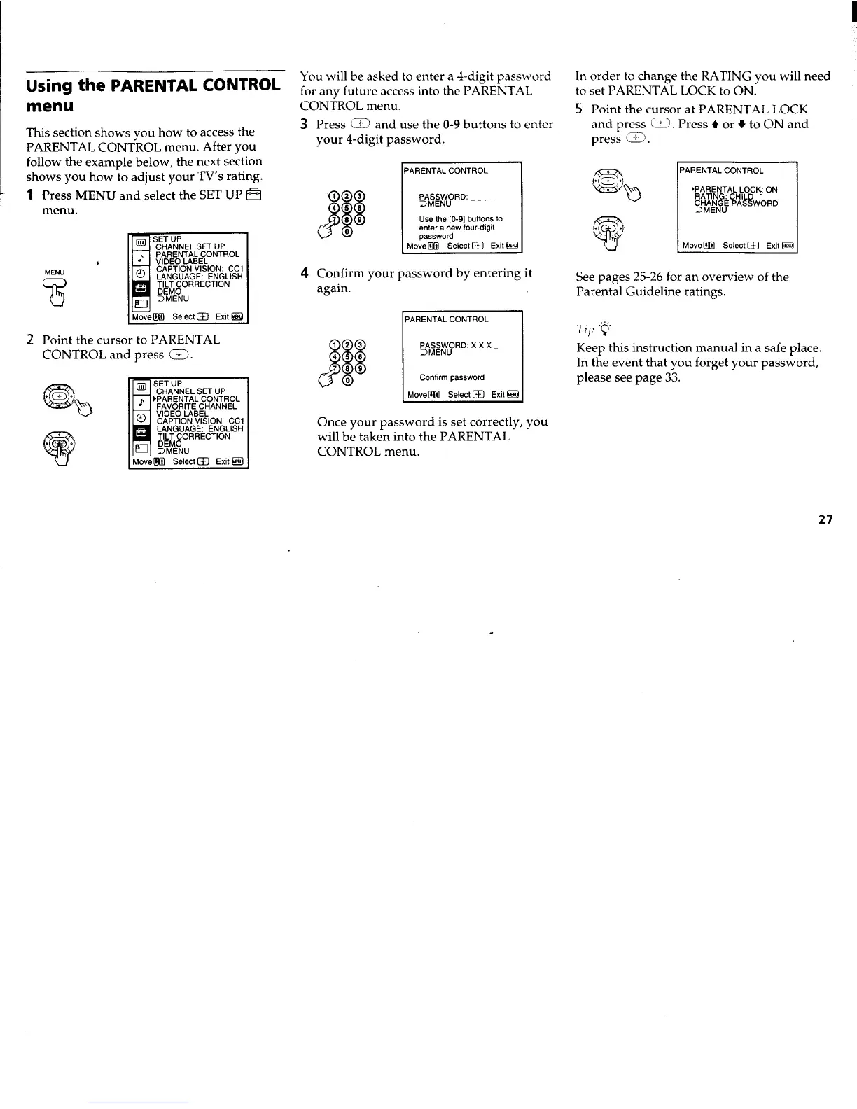 Sony TRINITRON KV-27FV15 - Parental Control Menu; Setting Up Password Access