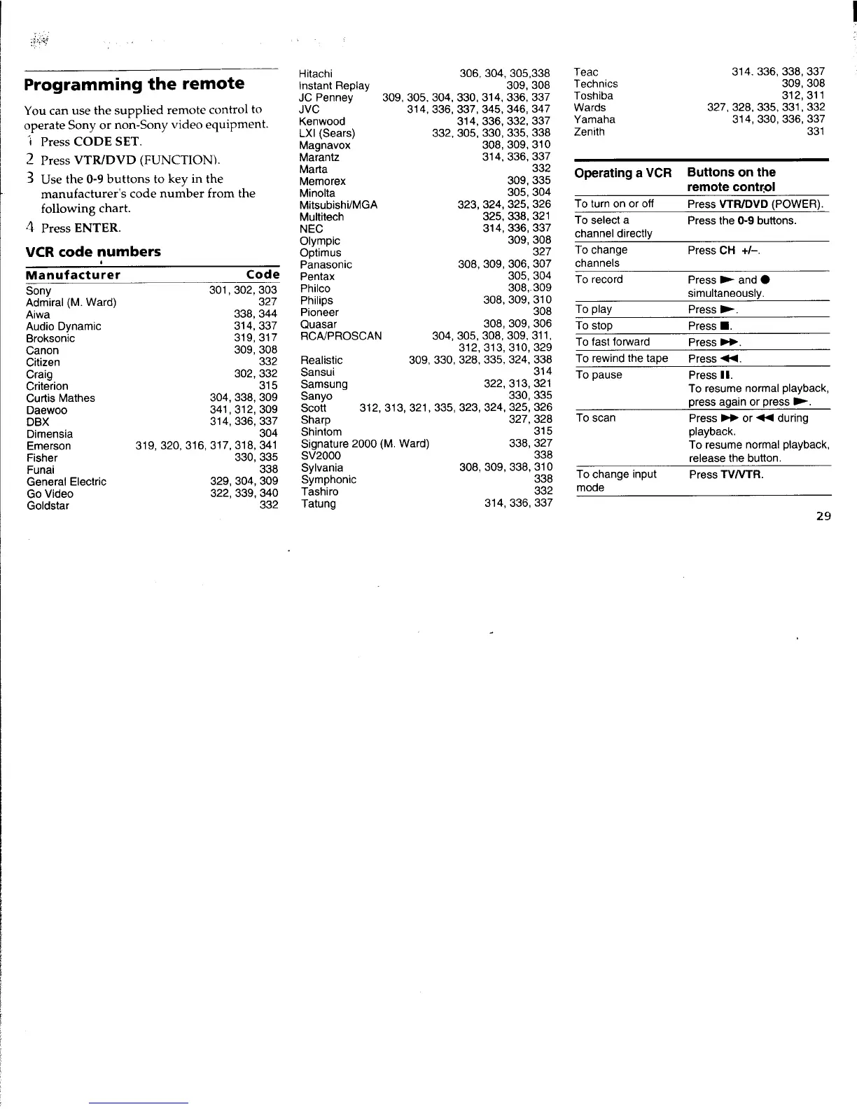Sony TRINITRON KV-27FV15 - Programming the Remote; VCR Control Codes and Operation