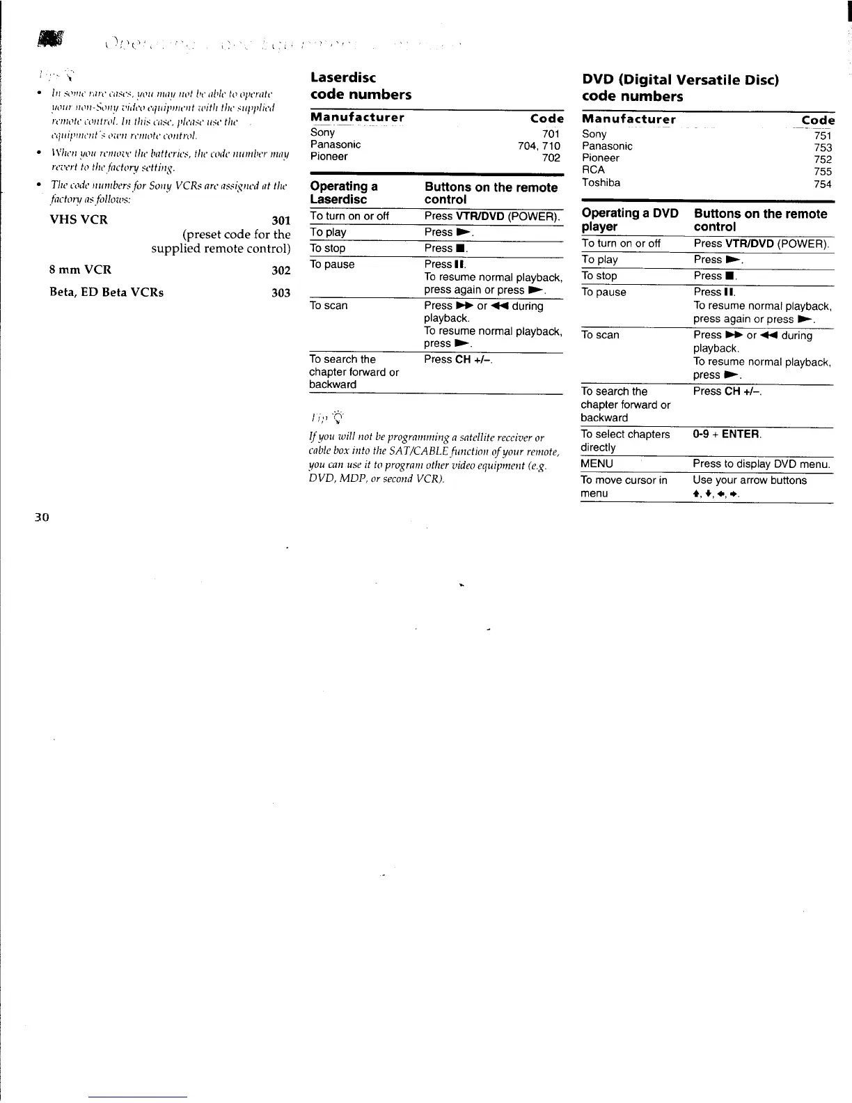 Sony TRINITRON KV-27FV15 - Remote Control for Other Devices; Laserdisc and DVD Codes; Laserdisc and DVD Operation