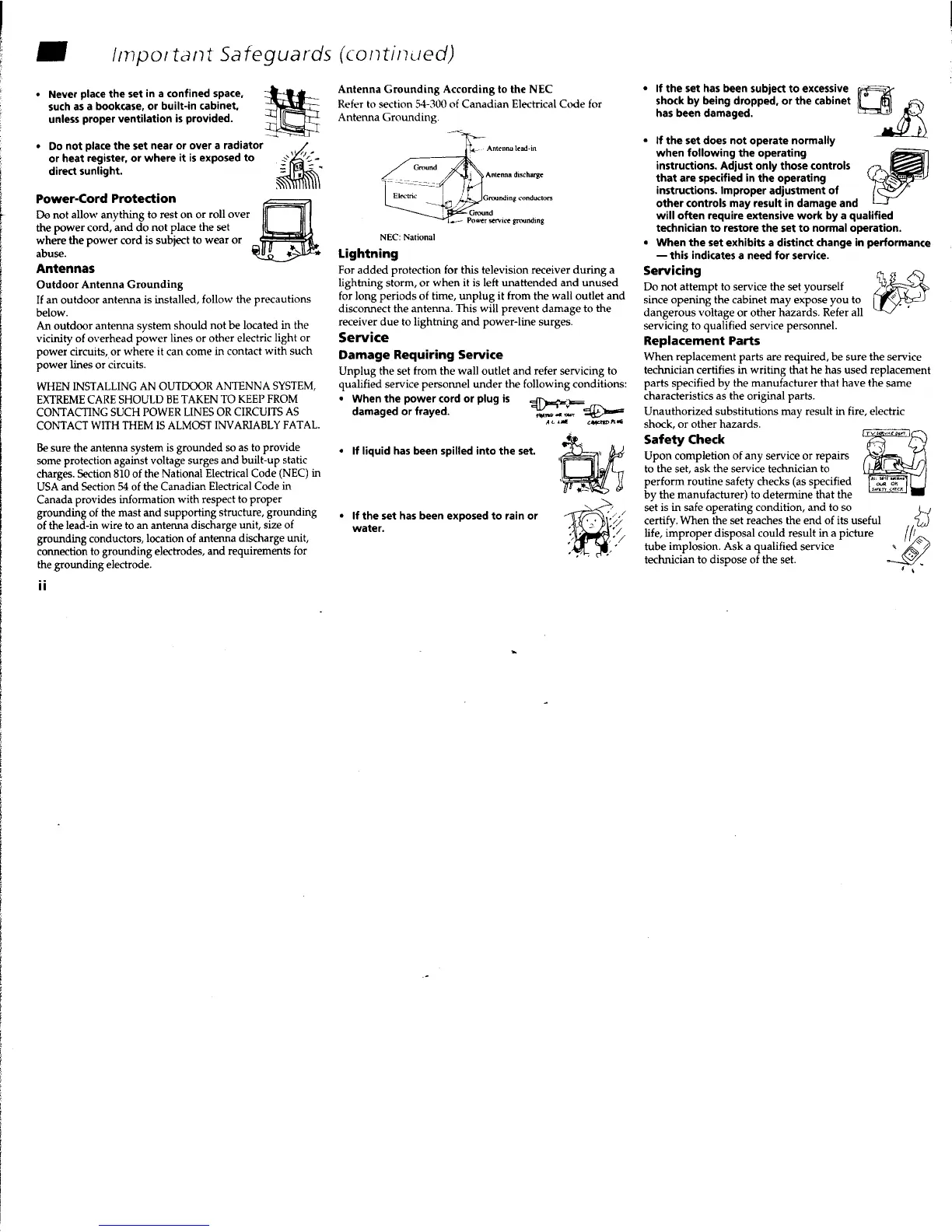 Sony TRINITRON KV-27FV15 - Continued Safeguards and Service; Power Cord and Antenna Safety; Servicing and Safety Checks