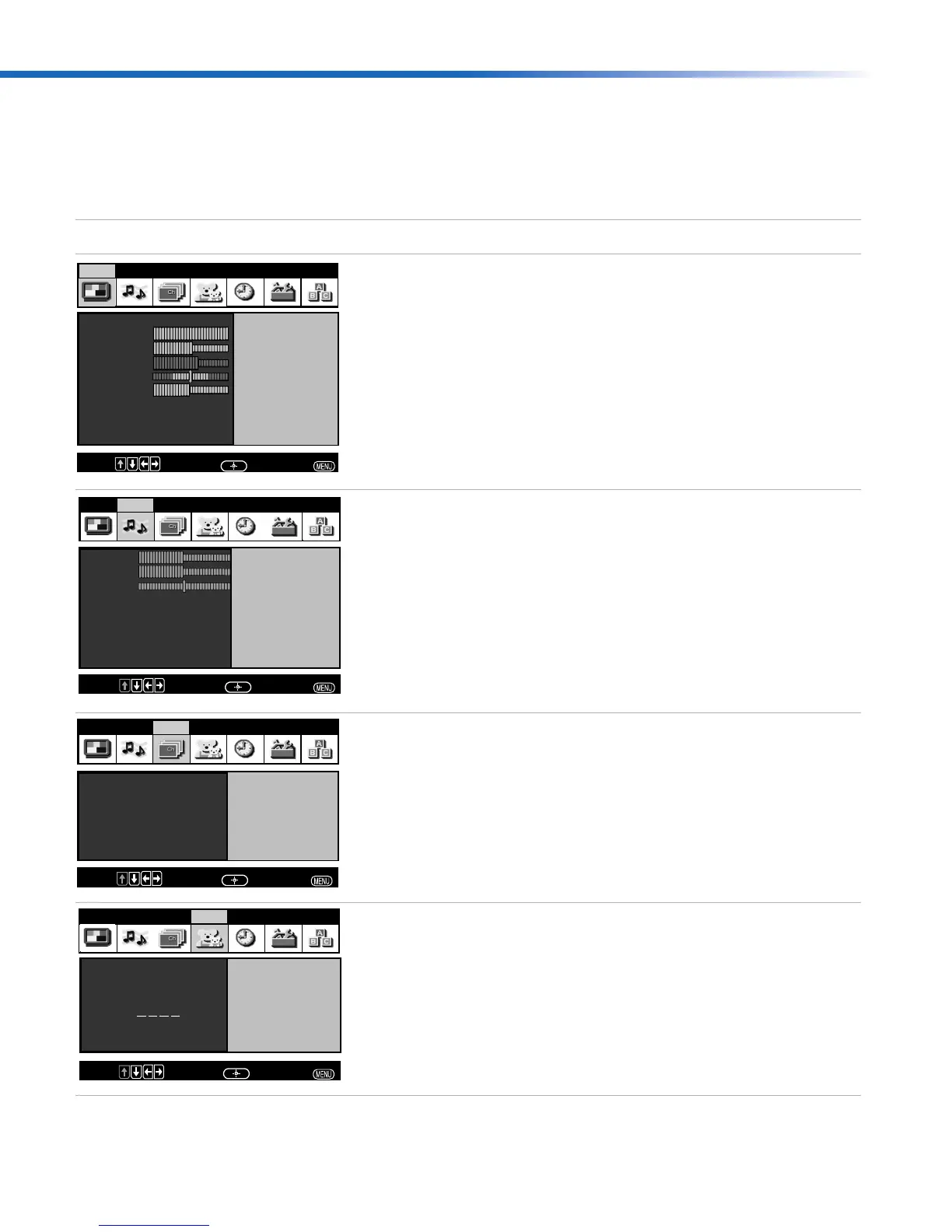The following settings are available in your on-screen menus. For more details on how to use the