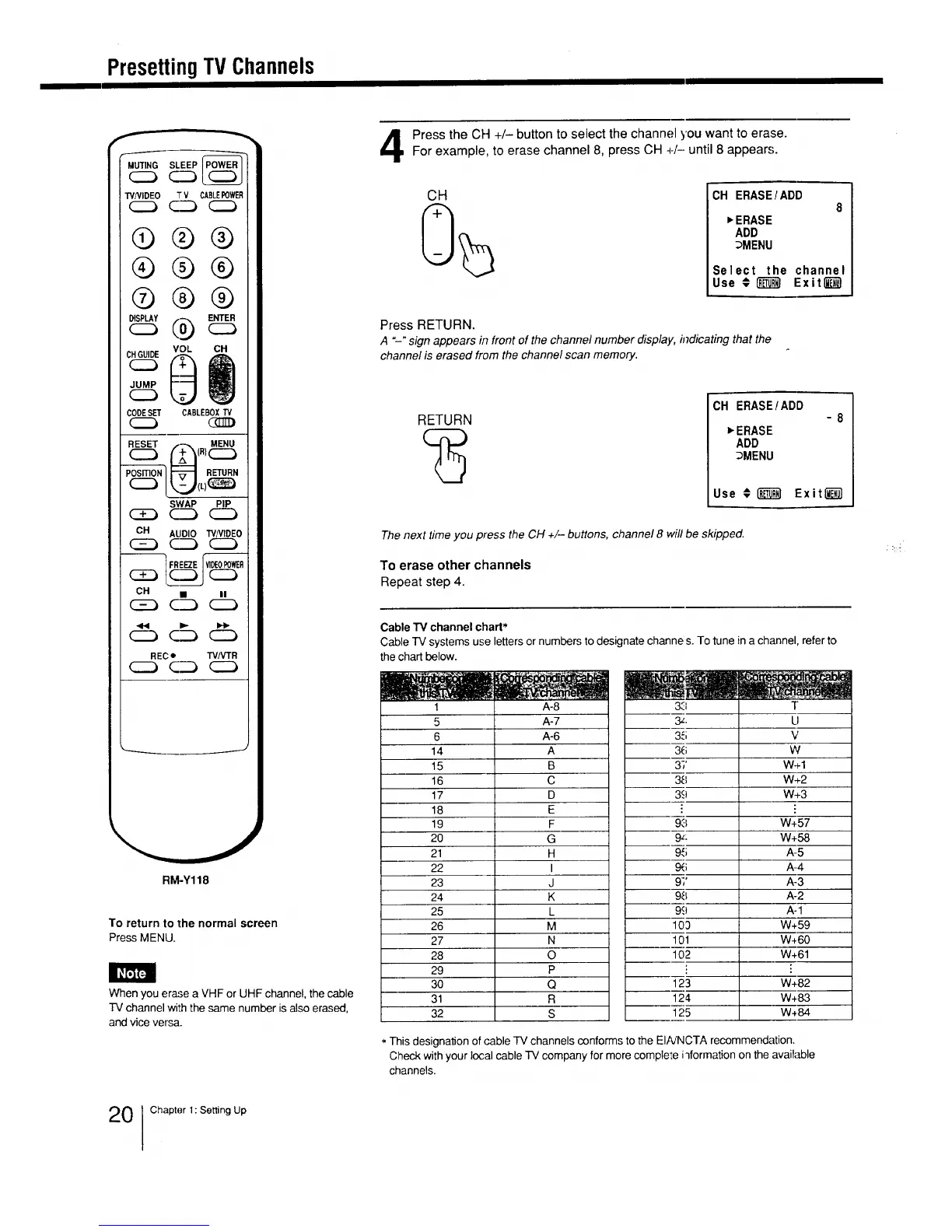 When you erase a VHF or UHF channel, the cable