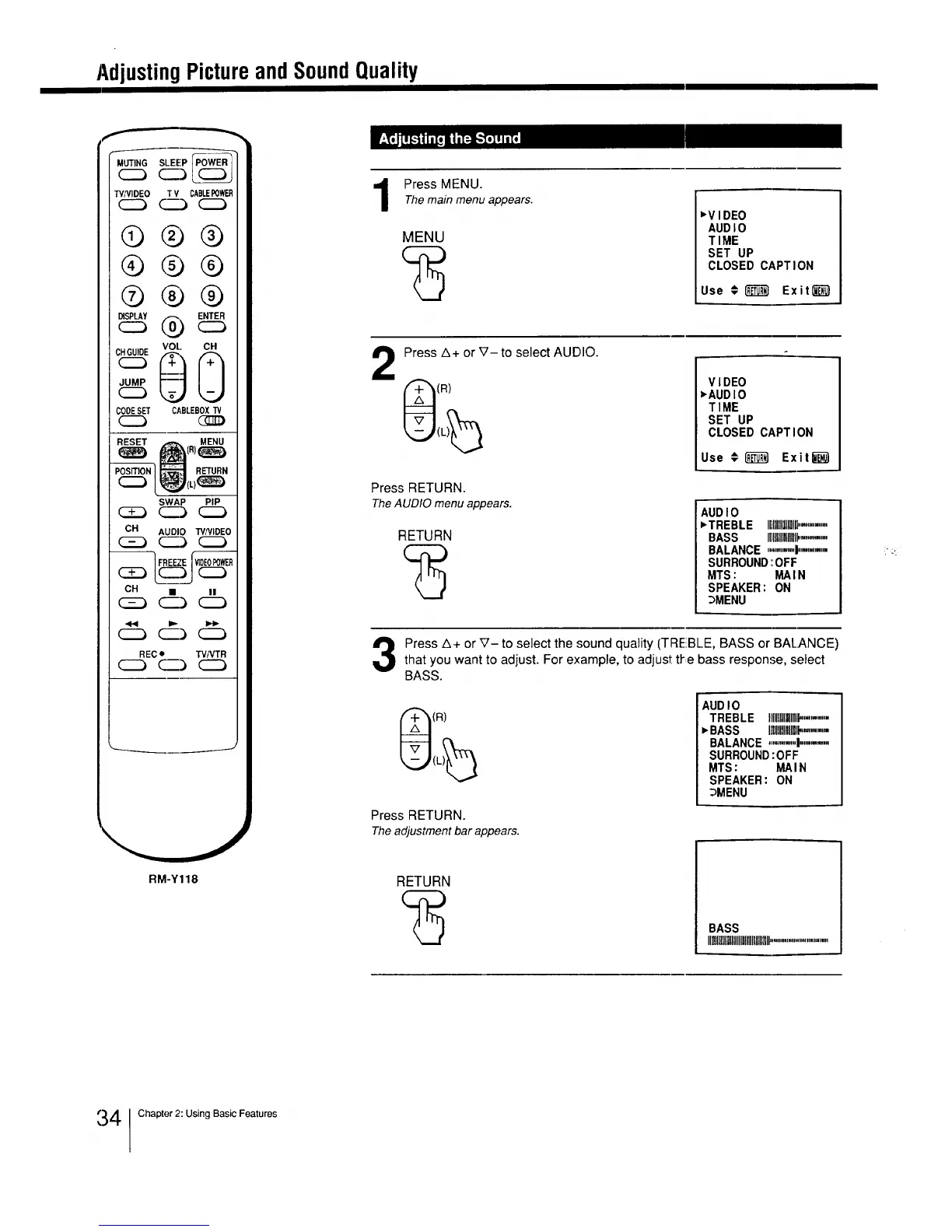 Press A+ or V- to select the sound quality (TREBLE, BASS or BALANCE)that you want to adjust. For example, to adjust tl-e bass response, select