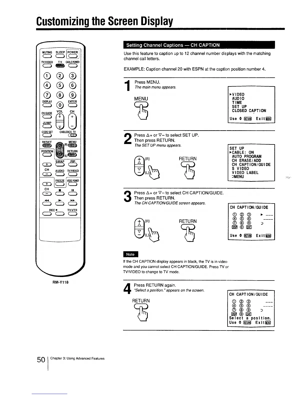 Press A+ or V- to select CH CAPTION/GUIDE.Then press RETURN.