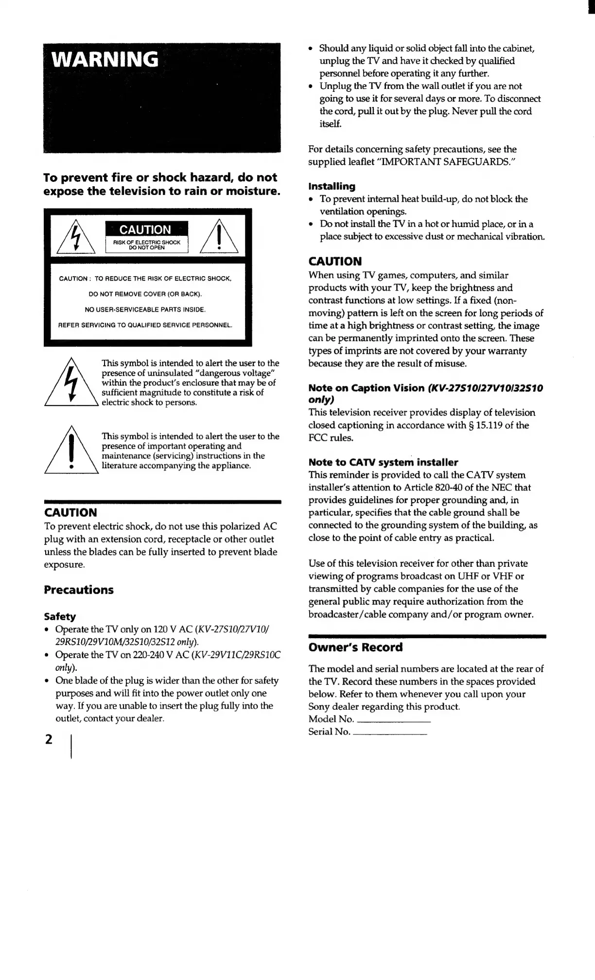 Sony Trinitron KV-27V10 - WARNING; General Safety Precautions; Precautions; Safety Guidelines