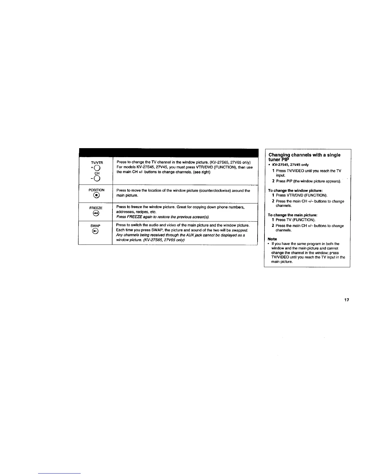 Press to change the rv channel in the window picture. (KV-27S65, 27V65 only)