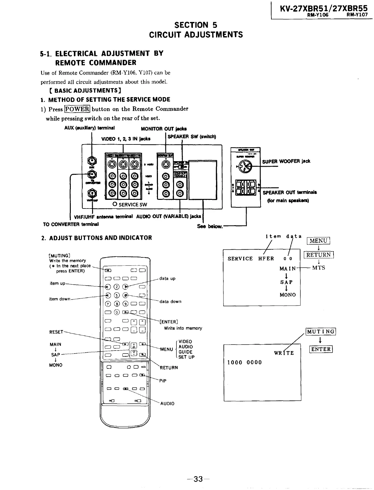 Sony Trinitron KV-27XBR51 - Section 5: Circuit Adjustments; Service Mode Entry and Remote Controls