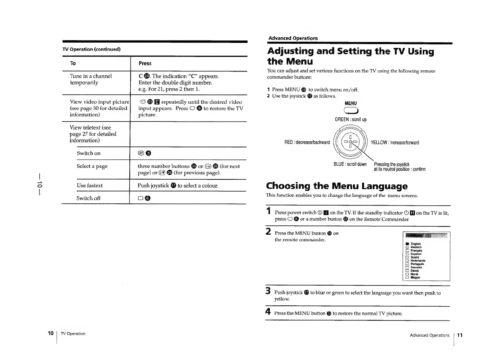 Sony Trinitron KV-29F3A - ADVANCED TV OPERATIONS; Menu-Based TV Adjustments