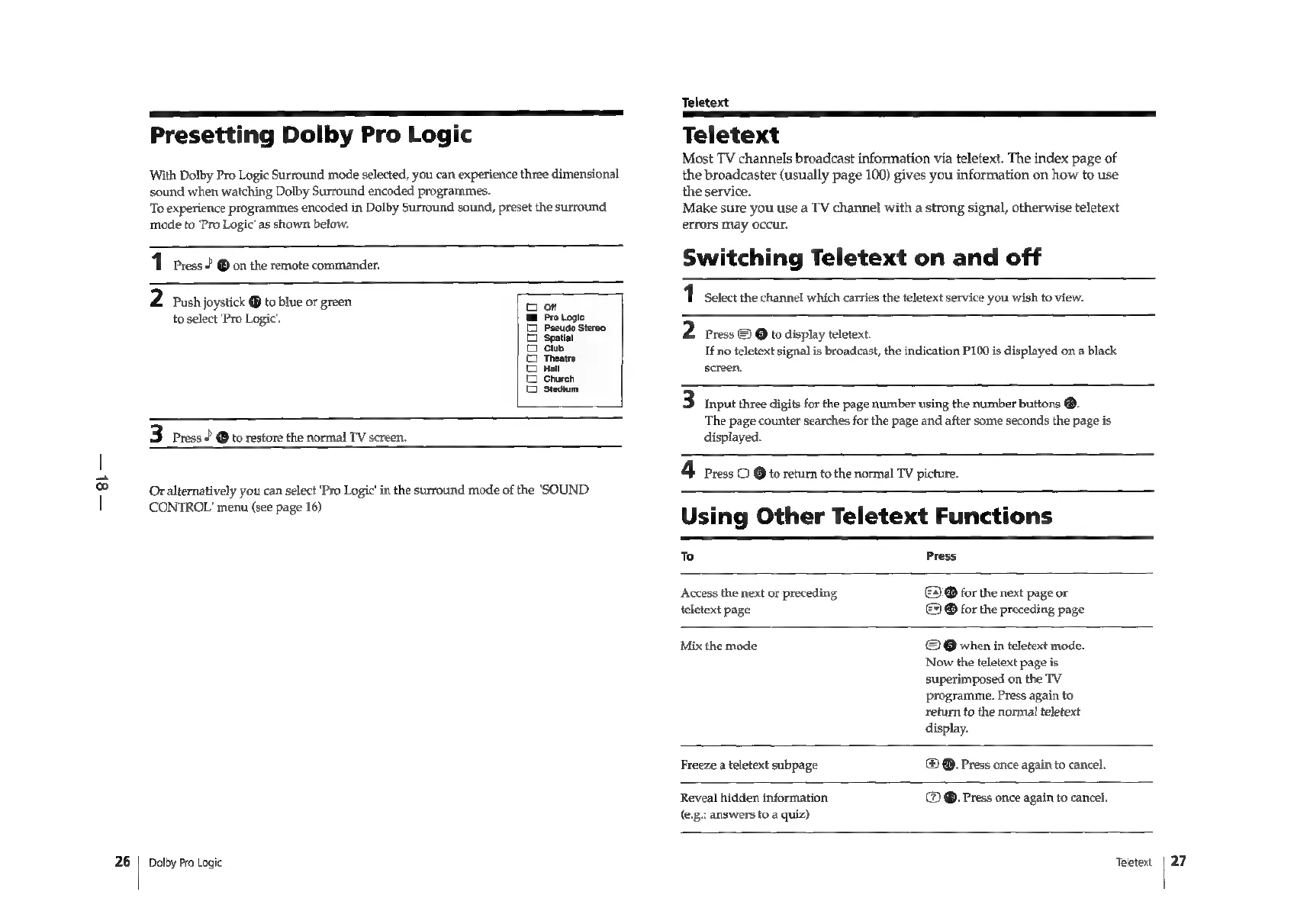 Sony Trinitron KV-29F3A - DOLBY PRO LOGIC AND TELETEXT; Presetting Dolby Pro Logic Mode; Teletext Service Operation