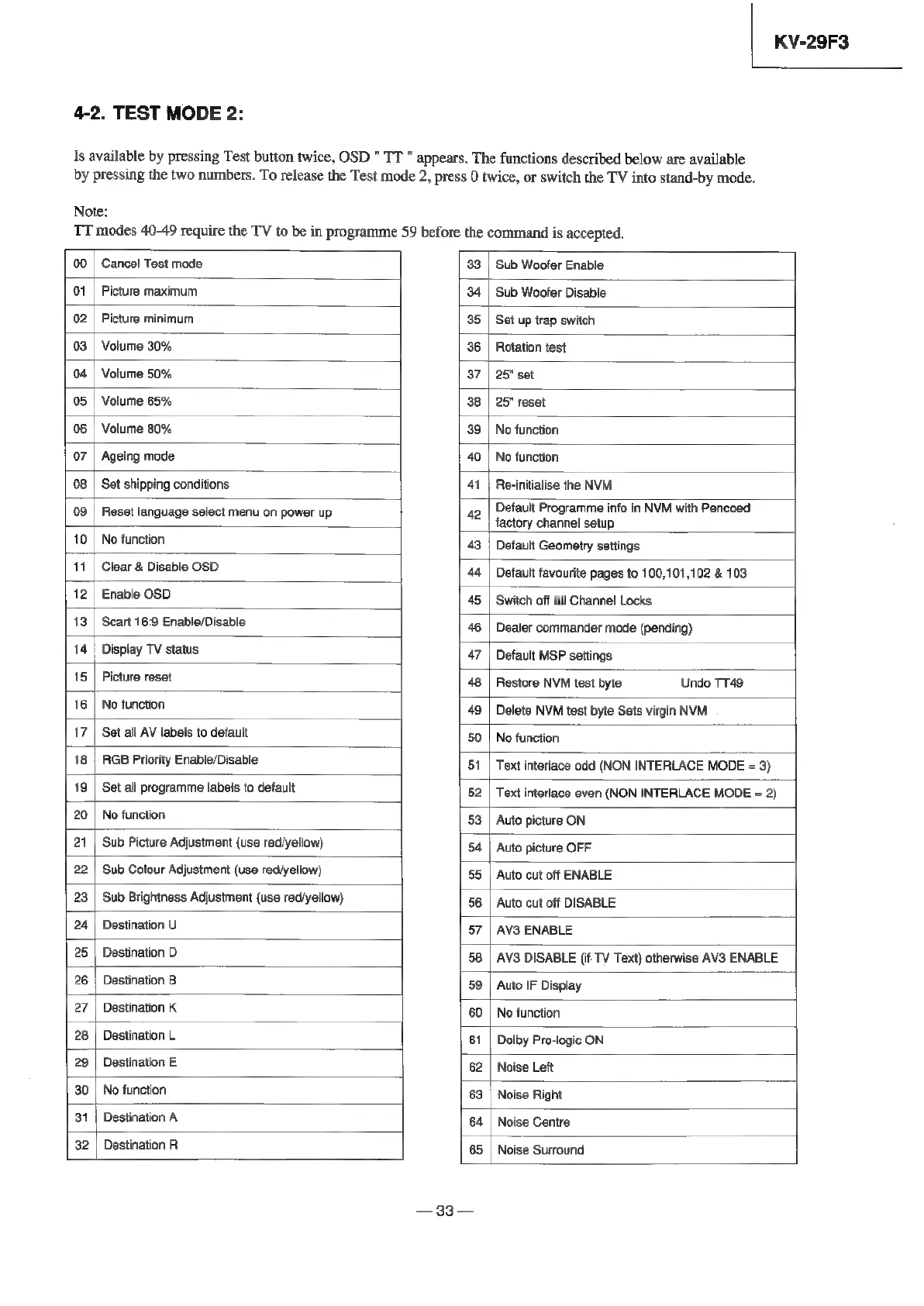 Sony Trinitron KV-29F3A - ADVANCED TEST MODES; Test Mode 2 Functions