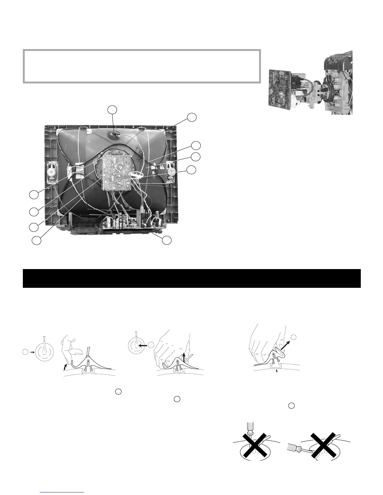 NOTE: After removing the anode cap, short circuit the anode of the picture tube and the anode cap to either the metal chassis, CRT shield, or carbon