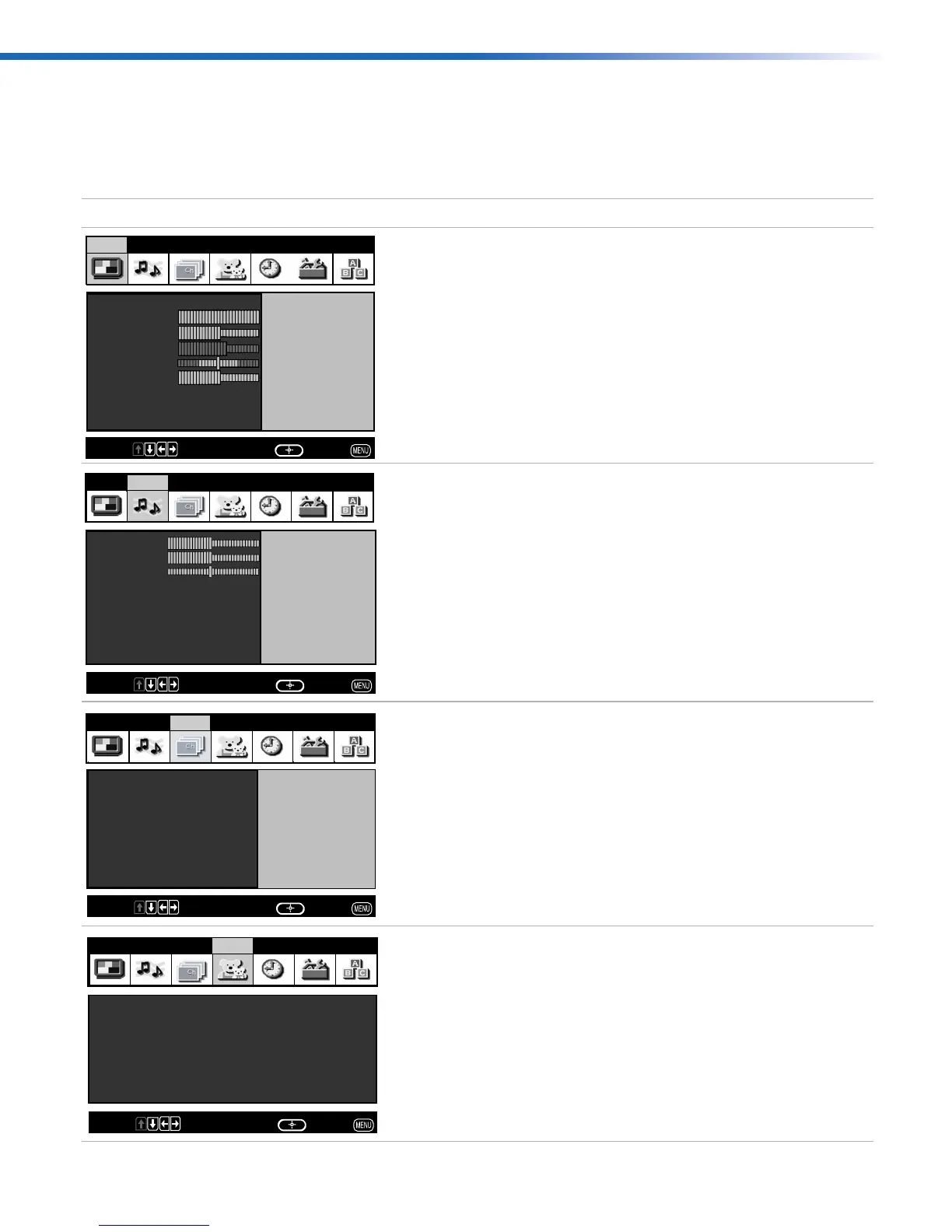 Los ajustes siguientes están disponibles en los menús de pantalla. Para obtener más detalles