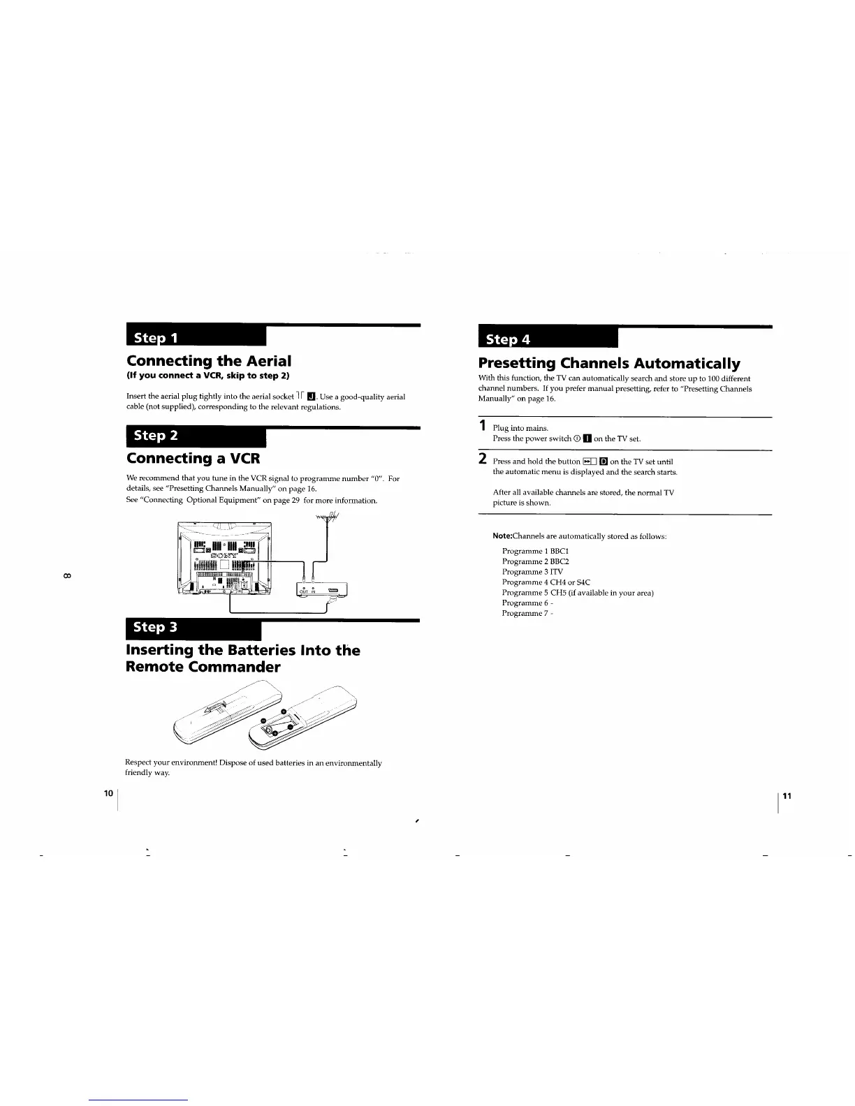 Sony TRINITRON KV-29FX11E - Initial Setup and Channel Presetting; Aerial Connection Guide; VCR Connection Recommendations; Remote Battery Insertion
