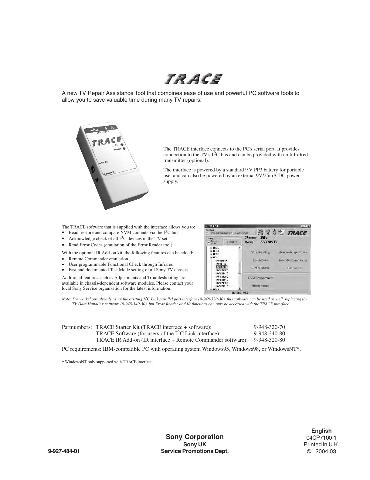 TV Data Handling software (9-948-340-50), but Error Reader and IR functions can only be accessed with the TRACE interface.