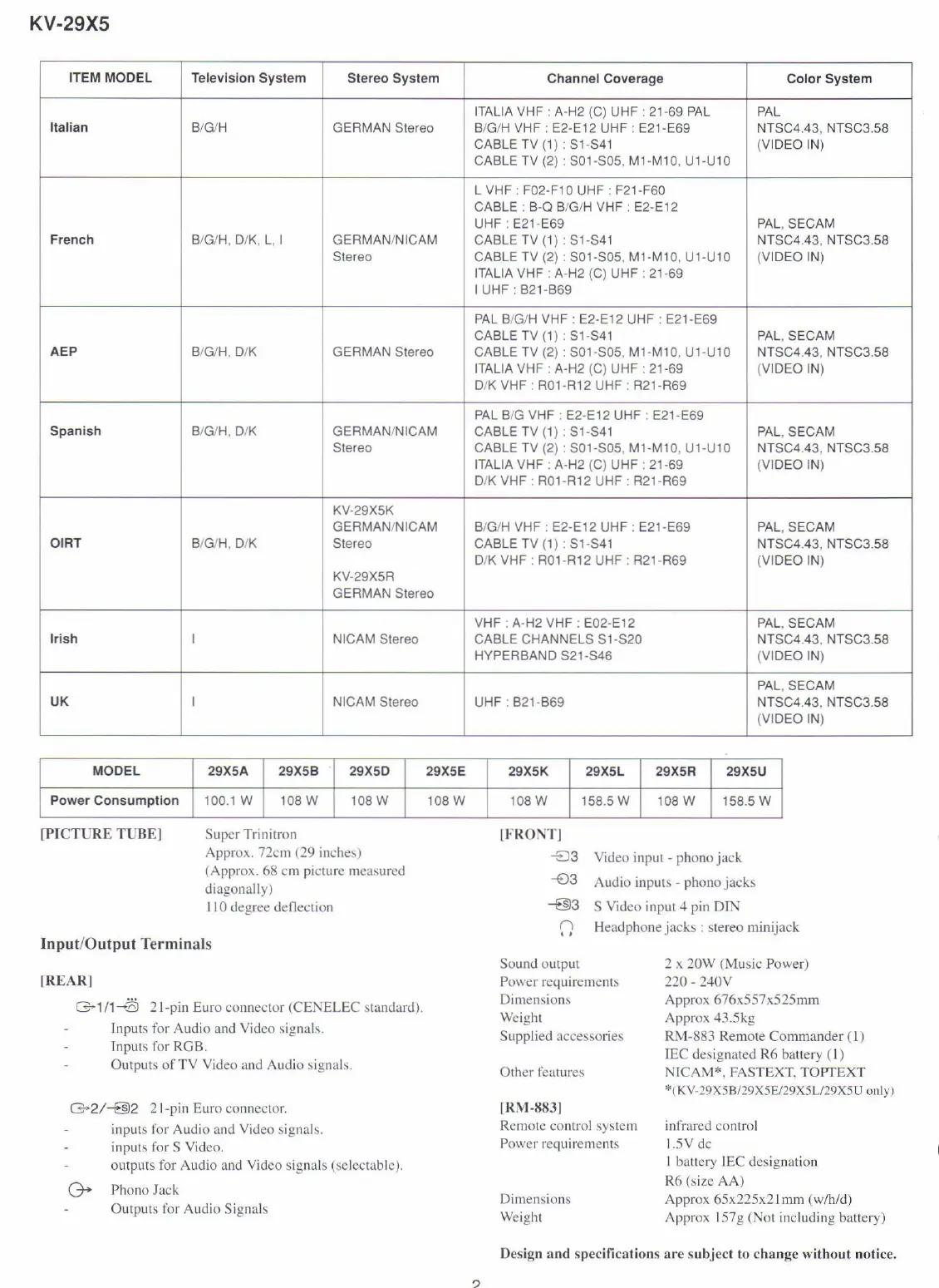 Sony TRINITRON KV-29X5A - Model Specifications and Features; Picture Tube Details; Input;Output Terminals