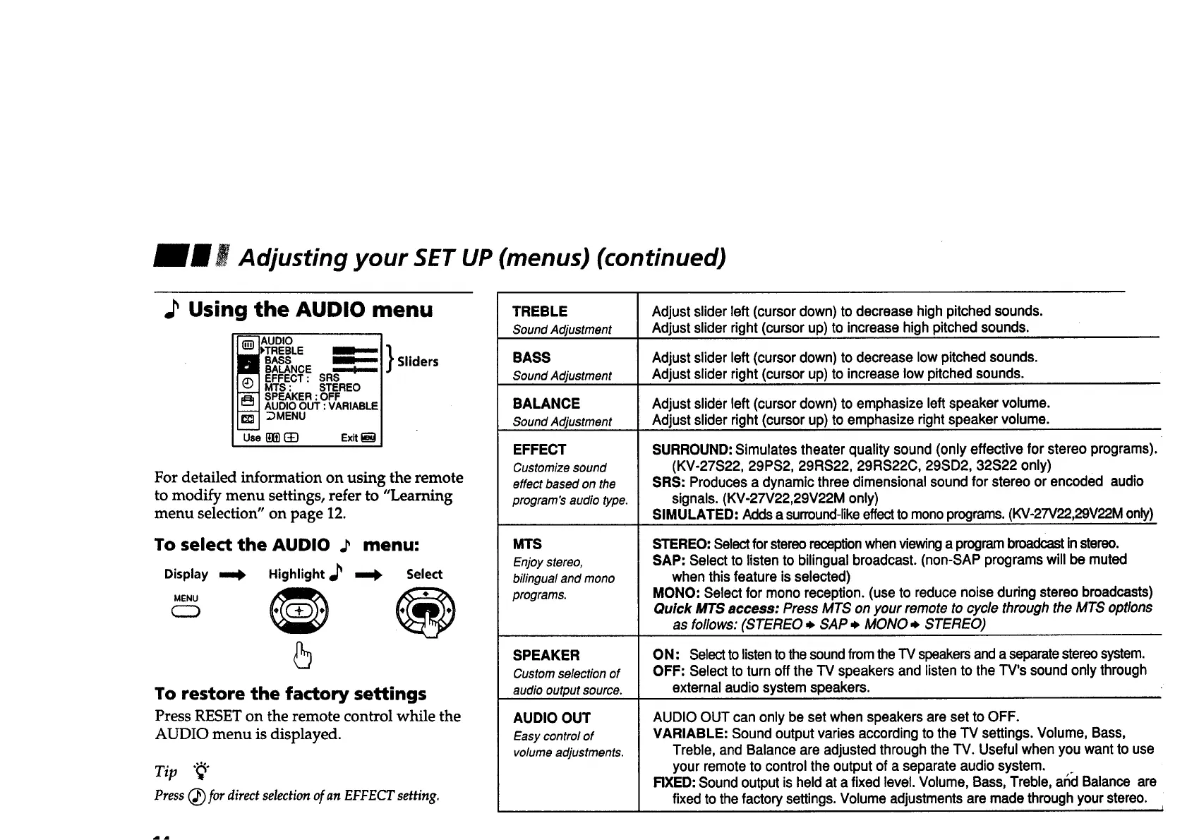 Treble, and Balance are adjusted through the TV. Usefulwhen you want to use